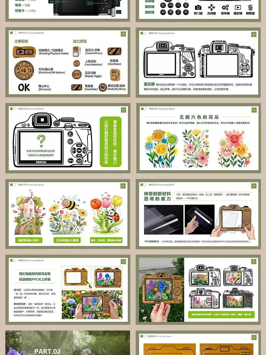 那你们知道,相机是怎么帮助我们记录美景的吗?其实,相机就像一只会记忆的大眼睛。它有一个圆圆的镜头,用来观察世界;有按钮和快门,帮助我们按下“记录”的瞬间;还有一个屏幕,可以让我们看到画面。不同的部分一起合作,就像一个小团队,把我们看到的美好变成一张张照片。如果现在给你一台相机,你最想记录什么呢?是五颜六色的花朵?是可爱的小动物?还是和好朋友一起开心玩耍的瞬间?