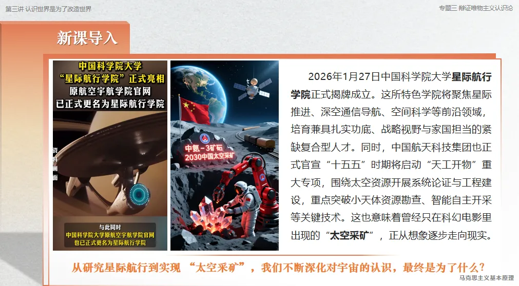 【P4】同学们,先让我们来看两则近期的热点新闻。2026年1月27日,中国科学院大学星际航行学院正式揭牌成立。这所特色学院将聚焦星际推进、深空通信导航、空间科学等前沿领域,重点培育兼具扎实专业功底、广阔战略视野与强烈家国担当的紧缺复合型人才。与此同时,中国航天科技集团也正式官宣,“十五五”时期将启动“天工开物”重大专项,围绕太空资源开发开展系统论证与工程建设,重点突破小天体资源勘查、智能自主开采等关键核心技术。这也意味着,曾经只在科幻电影里出现的“太空采矿”,正一步步从想象走向现实。接下来,请大家观看一段视频,深入了解这些热点事件【播放视频】。视频播放完了,老师想请大家思考一下:从研究星际航行到逐步实现“太空采矿”,我们人类不断深化对宇宙的认识,最终的目的是什么呢?