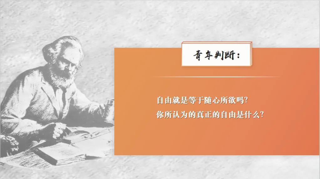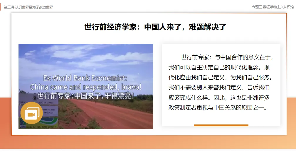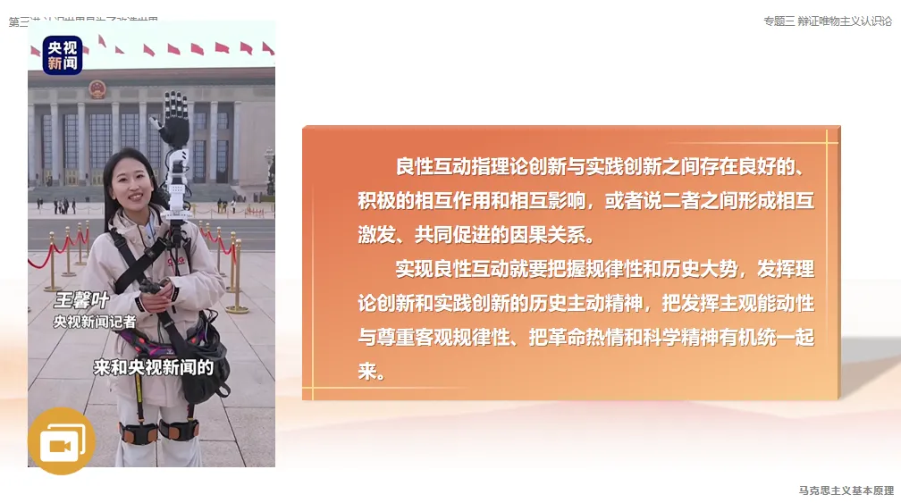 【P8】我们来通过“火星移民”的视频来看看人类对太空的探索。那同学们,火星,为什么会成为人类移民太空的首选地。根据中国航天之前发布的“宇宙计划”,2030年前后将实施火星采样返回任务。那么,这个任务的目的是找什么?答案是,找水。孙泽洲说,若找到可利用的水资源,这将为未来的星际探索提供宝贵的支持。不仅火星移民不再是科幻,更期待能在这片土地上发现生命的痕迹。另外,火星的“晚年状态”像一面镜子,火星比地球演化得更超前,研究它或许能为地球未来提供预警。通过这个例子,我们可以看到,客观世界并不能自动满足人类的需要。火星移民和星际探索需要我们主动去探索和开发,而不是等待客观世界自动提供条件。这就需要我们不断认识世界,改造世界,以满足人类的生存和发展需要。【P12】我们可以运用一个简单的例子来解释客观世界与主观世界的对立统一关系。 2025年全国两会期间,人工智能技术的应用助力两会的高效开展和信息传播,成为名副其实的“神秘助手”。人工智能在两会报道中的广泛应用,不仅提升了媒体的工作效率和内容质量,更重要的是改变了媒体工作者的思维方式,从传统的经验驱动、单兵作战转向数据驱动、协同作战和个性化服务。这种转变不仅推动了媒体行业的智能化发展,也为公众提供了更加丰富、高效、精准的新闻体验。我们来看看这个视频。在这个例子中,人工智能技术的发展是客观世界的一部分,而媒体工作者的思维方式和公众的新闻体验则是主观世界的一部分。人工智能技术的应用改变了媒体工作者的思维方式,这是主观世界对客观世界的反映。同时,媒体工作者通过运用人工智能技术来提升工作效率和内容质量,这是主观世界反作用于客观世界的表现。【P15】说到这里就不得不提到我们党找到的跳出“历史周期率”的第二个答案:自我革命。请同学们观看视频。从视频中可以看出“经过百年奋斗特别是党的十八大以来新的实践,党又给出了第二个答案,这就是自我革命。自我革命就是补钙壮骨、排毒杀菌、壮士断腕、去腐生肌,不断清除侵蚀党的健康肌体的病毒,不断提高自身免疫力,防止人亡政息。”在这个例子中,党的自我革命就是一种自我改造。通过自我革命,党不断清除侵蚀党的健康肌体的病毒,不断提高自身免疫力,防止人亡政息。这种自我改造不仅有助于党的健康发展,也有助于实现国家长治久安。【P17】说到当下的实践热点,今年两会期间,人工智能无疑是大家关注的焦点话题。政府工作报告明确提出要深化拓展“人工智能+”,促进新一代智能终端和智能体加快推广,推动人工智能在各行业规模化应用。那么在这样的AI时代,我们青年一代应该具备哪些核心素质,如何才能更快地适应时代发展、立足时代潮头呢?接下来,我们就听听专家的专业讲解,从中寻找答案【播放视频】。从视频中我们能够清晰感受到,两会明确传递出一个信号:人工智能时代的教育目标,是培养能够驾驭技术、引领创新的创造者,这也正是我们强调“注重改造主观世界”的核心意义所在——只有不断提升自身素养,主动拥抱AI时代的变革,才能在人机协同中实现自身价值,更好地参与到认识世界、改造世界的实践中去。【P23】我们来看一个视频案例。视频中世行前经济学家强调,与中国合作的意义在于,我们可以自主决定自己的现代化理念。现代化应由我们自己定义,为我们自己服务。我们不需要别人来替我们定义,告诉我们应该变成什么样。因此,这也是非洲许多政策制定者重视与中国关系的原因之一。在这里,我们可以看到,自主决定自己的现代化理念,实际上体现了马克思主义自由观的一个重要方面。马克思主义认为,自由不仅仅是个人的权利,更是社会和经济条件下的集体自由。在这种自由观下,每个国家和民族都有权利根据自己的实际情况,自主选择发展道路和发展模式,而不是被外部强加。中国的发展经验表明,通过自主选择和努力,可以实现经济的快速发展和社会的全面进步。这种自主性不仅体现在经济领域,也体现在文化、社会和政治等多个方面。中国的成功经验为其他发展中国家提供了宝贵的借鉴,也证明了马克思主义自由观在当代社会的现实意义。总之,马克思主义自由观强调的是在社会和经济条件下的集体自由,每个国家和民族都有权利自主选择发展道路。中国的发展经验证明了这一点,也为其他发展中国家提供了借鉴。在全球化的今天,我们更应该坚持这种自由观,通过自主选择和开放合作,实现共同发展和繁荣。【P49】通过学习理论创新与实践创新的关系,我们明白了理论创新不能异想天开,原因就在于异想天开的实质是脱离了现实的空想,缺乏实践基础的支撑。理论创新的基础在实践创新,我们只有遵循党的思想路线,一切从实际出发,实事求是,努力实现守正创新基础上的理论创新和实践创新的良性互动,才能做到科学的理论创新。