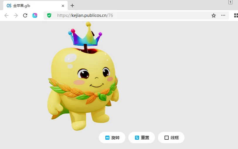 本次全新上线【3D模型】,用户可以上传glb格式的3D模型文件,打开即可在浏览器上预览效果,可以用作各类形象的展示。下图是一个示例文件,访问地址:https://kejian.publicos.cn/76(复制到浏览器打开)