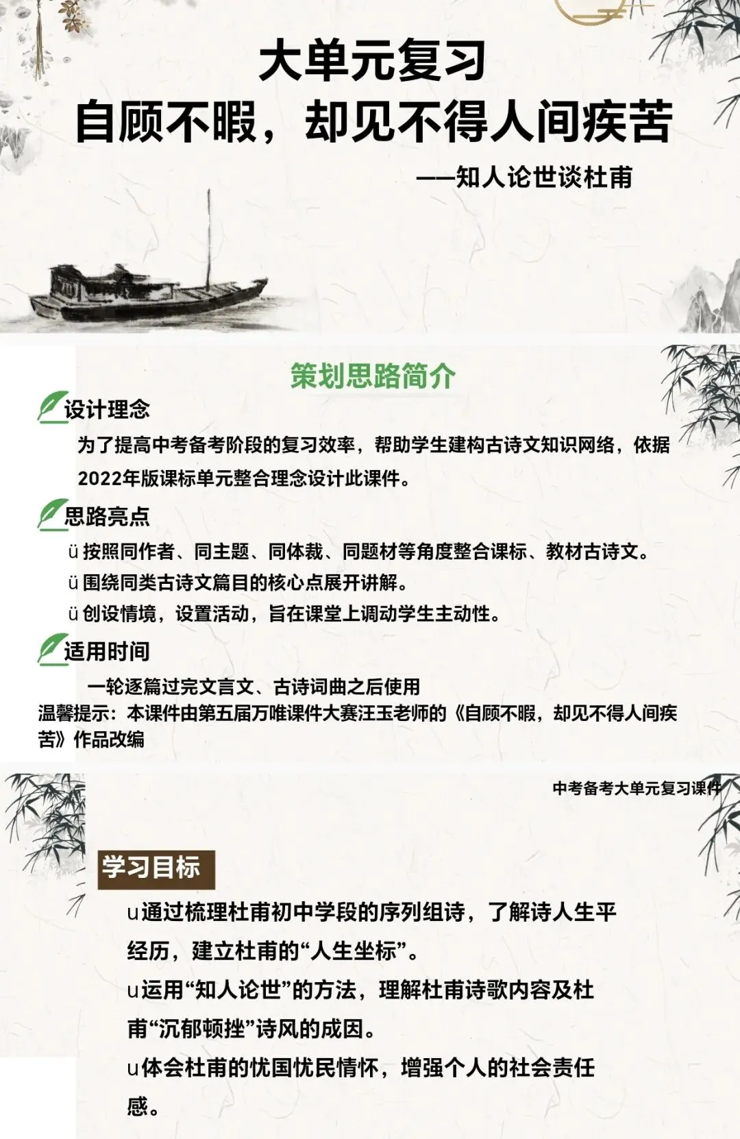 今天给大家分享一套非常实用的杜甫大单元复习课件,主题是“自顾不暇,却见不得人间疾苦——知人论世谈杜甫”。