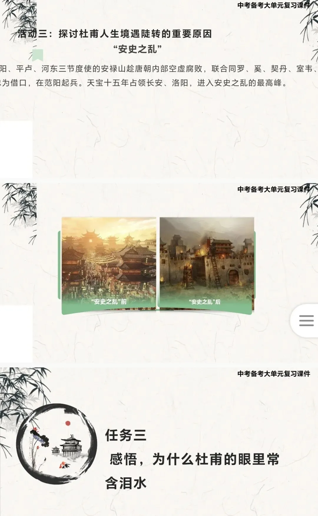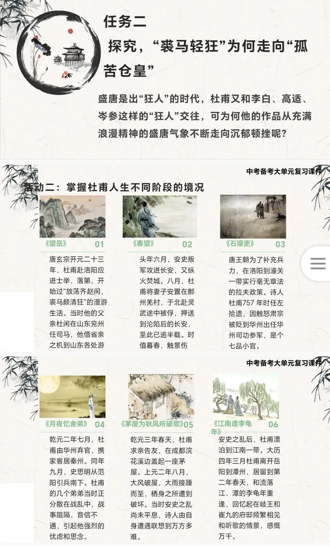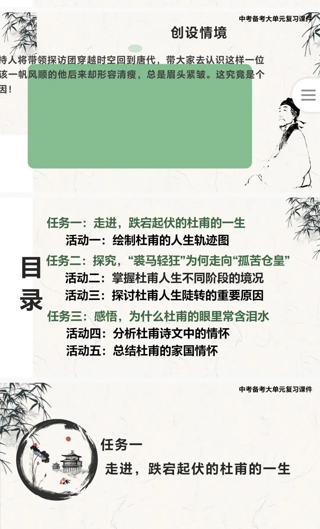 课件整体设计紧扣新课标大单元理念,把初中阶段杜甫的重点篇目整合在一起,从人生轨迹、诗风变化、家国情怀三个任务层层推进,既有知识梳理,也有情境活动,课堂上直接用,学生更容易理解。