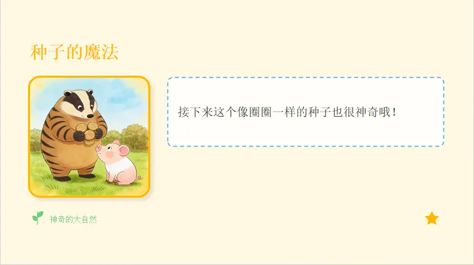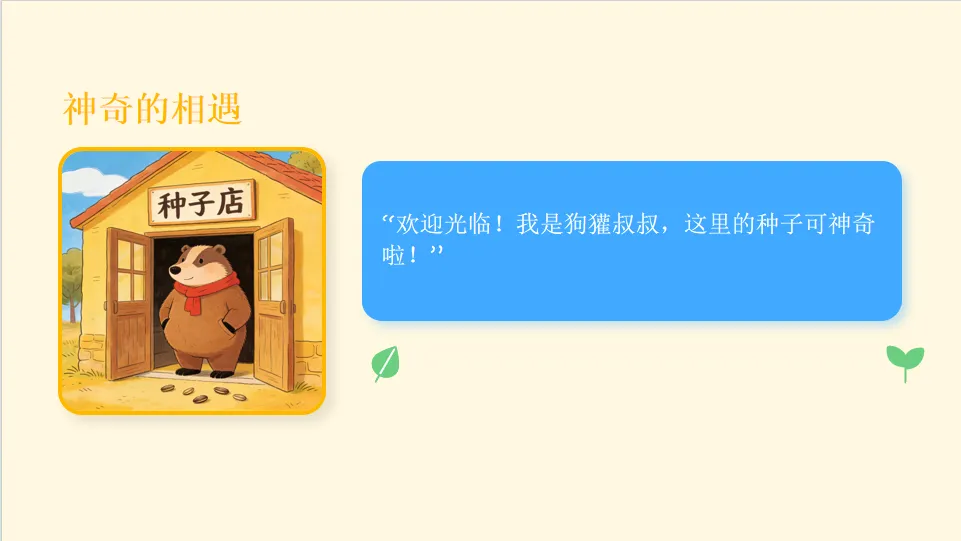 - 播放 PPT,讲述故事: 教师结合 PPT,声情并茂地讲述《神奇种子店》的故事。