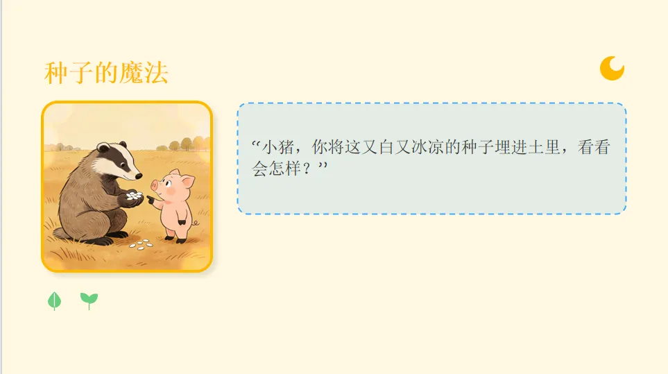 - 讲述到狗獾叔叔展示种子时: “狗獾叔叔拿出了哪些神奇的种子?它们分别长出了什么?”(引导幼儿观察种子的特征与长出东西的关联)