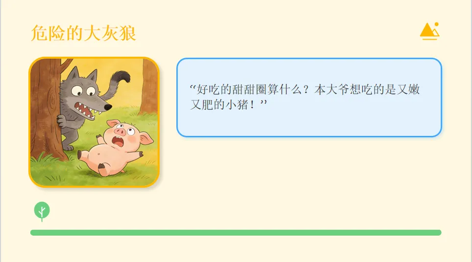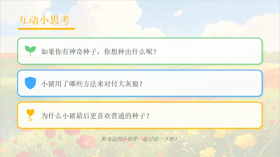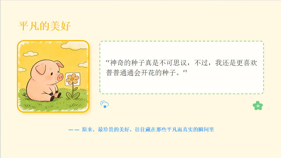 - 总结: 教师总结故事内容,强调小猪的智慧和勇敢,并再次引导幼儿理解 “平凡的种子也能开出美丽的花,平凡的生活也很美好”。