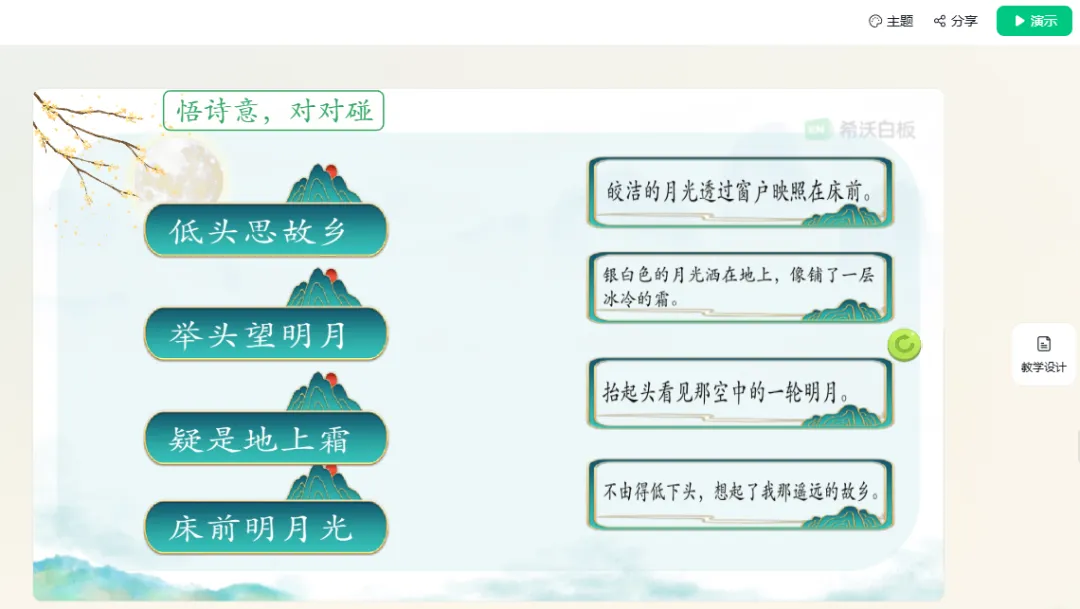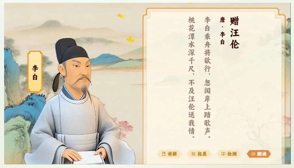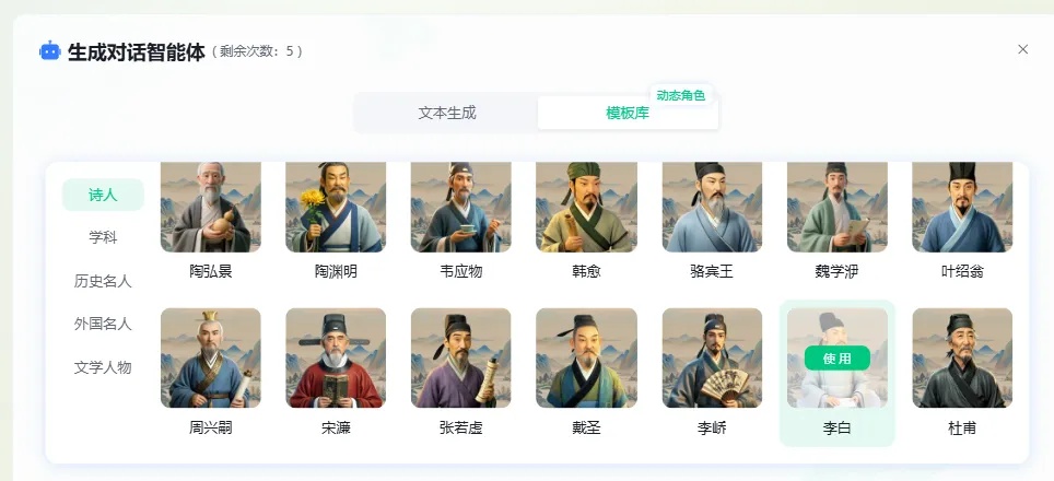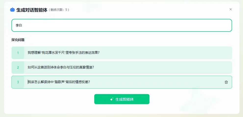 这是本次更新的王炸功能。生成课件后,你会发现它自带一个默认AI角色——比如你讲《赠汪伦》,系统会自动生成“诗人李白”的智能体。
