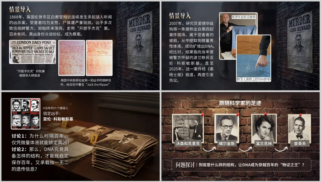 好的课堂导入,能让学生瞬间进入学习状态。这节课件我选用了“开膛手杰克百年悬案DNA破案”这一真实事件作为核心情境,用真实的刑侦案例抛出核心问题:1.为什么时隔百年,仅凭微量体液就能锁定真凶? 2.DNA凭什么能穿越百年指认真凶?