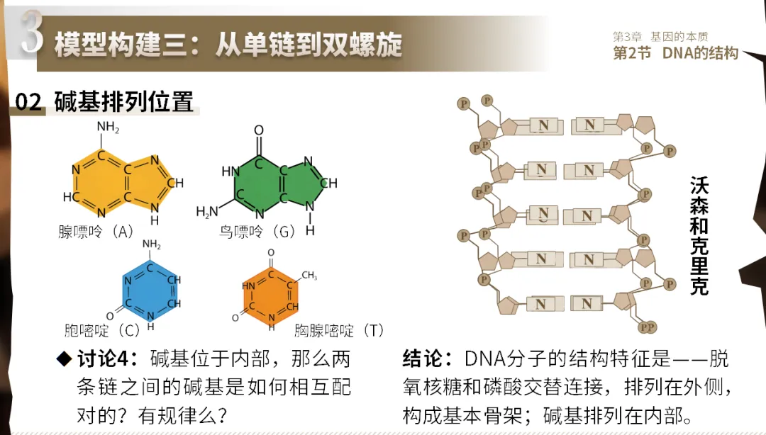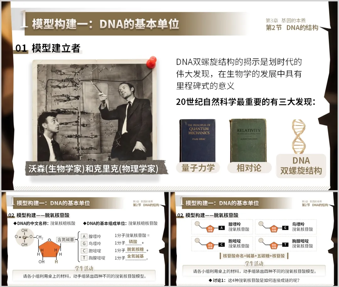 设计意图:动手操作可将抽象概念具象化,增强空间认知。沃森和克里克的引入激发科学探究兴趣。