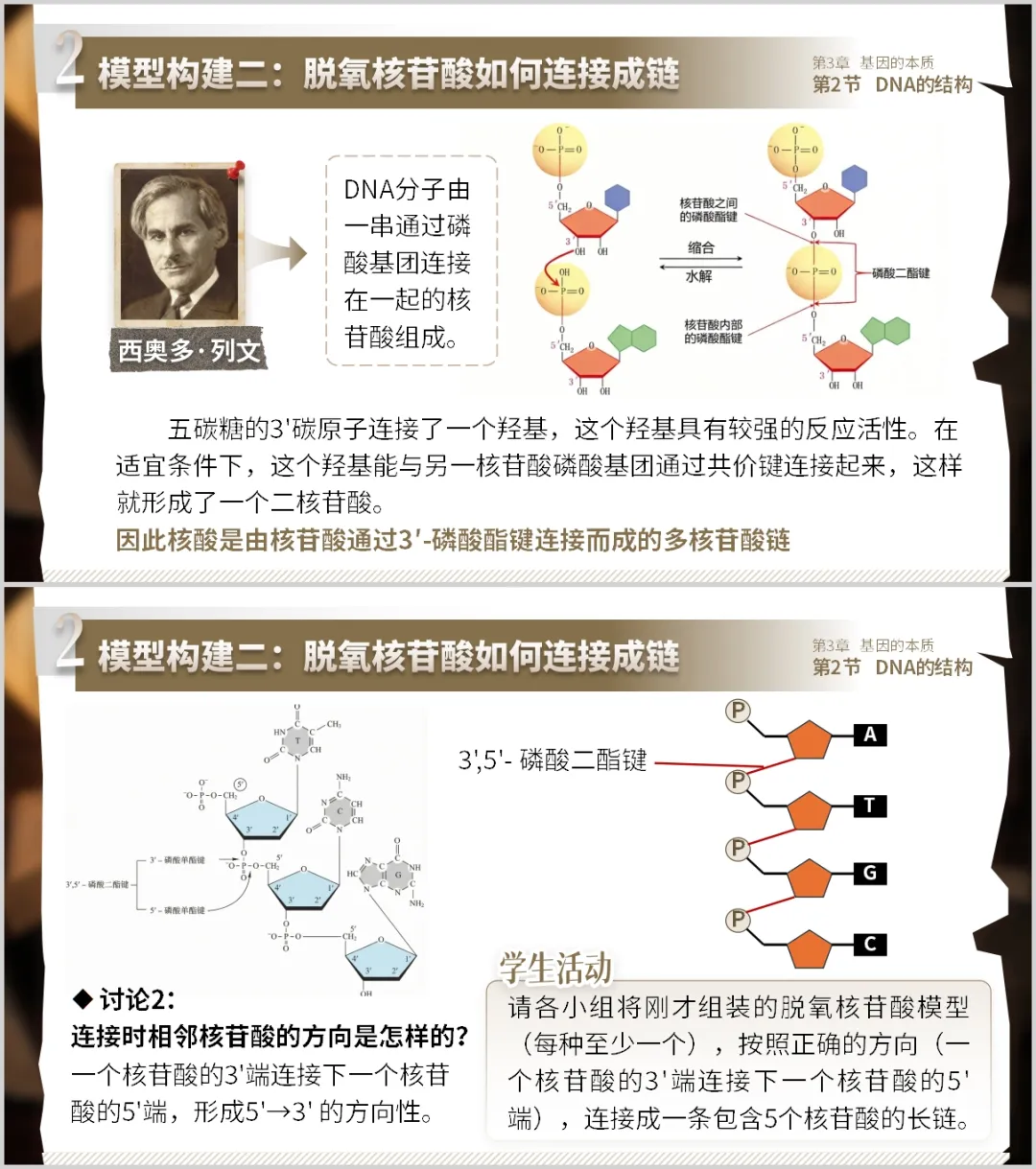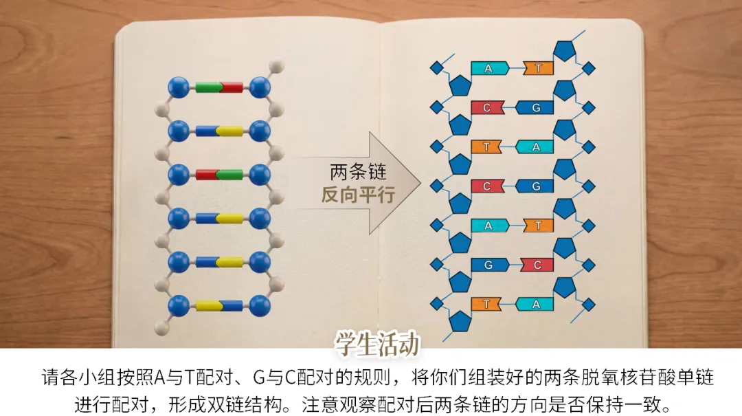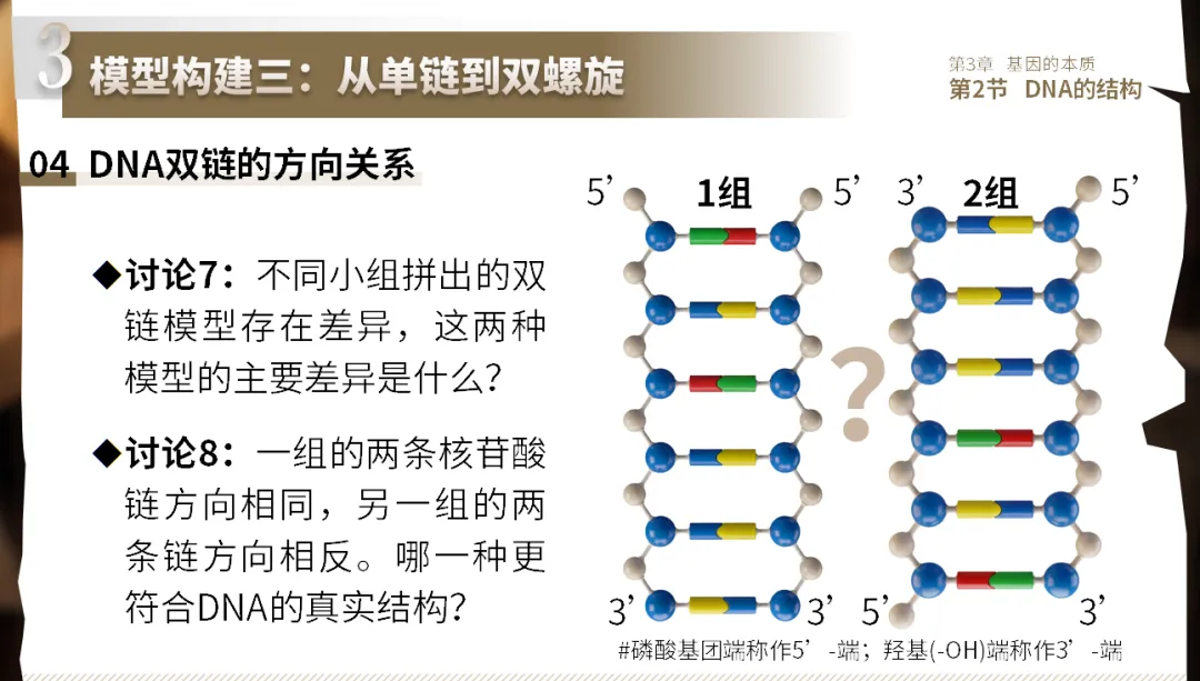 设计意图:引入列文科学史,帮助学生理解DNA一级结构的认知历程。动手连接理解磷酸二酯键的化学本质和链的方向性,为反向平行埋下伏笔。