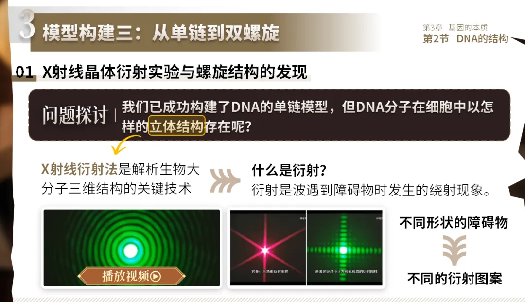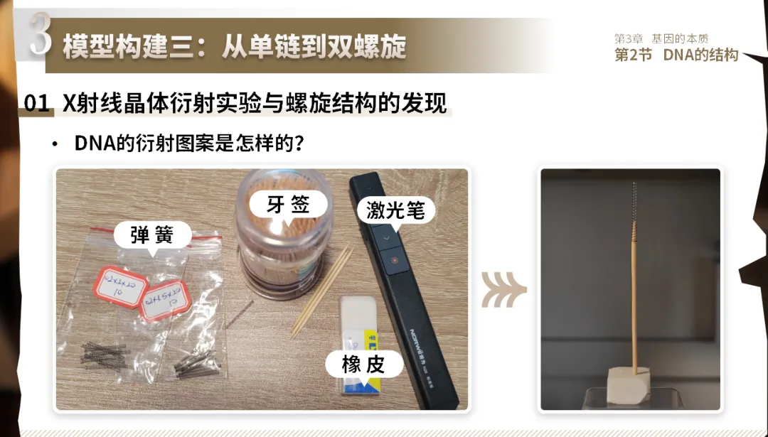 进一步模拟衍射实验(激光笔+弹簧),观察弹簧的X形衍射图案;展示富兰克林拍摄的DNA衍射图谱,得出“DNA是螺旋结构”的结论。