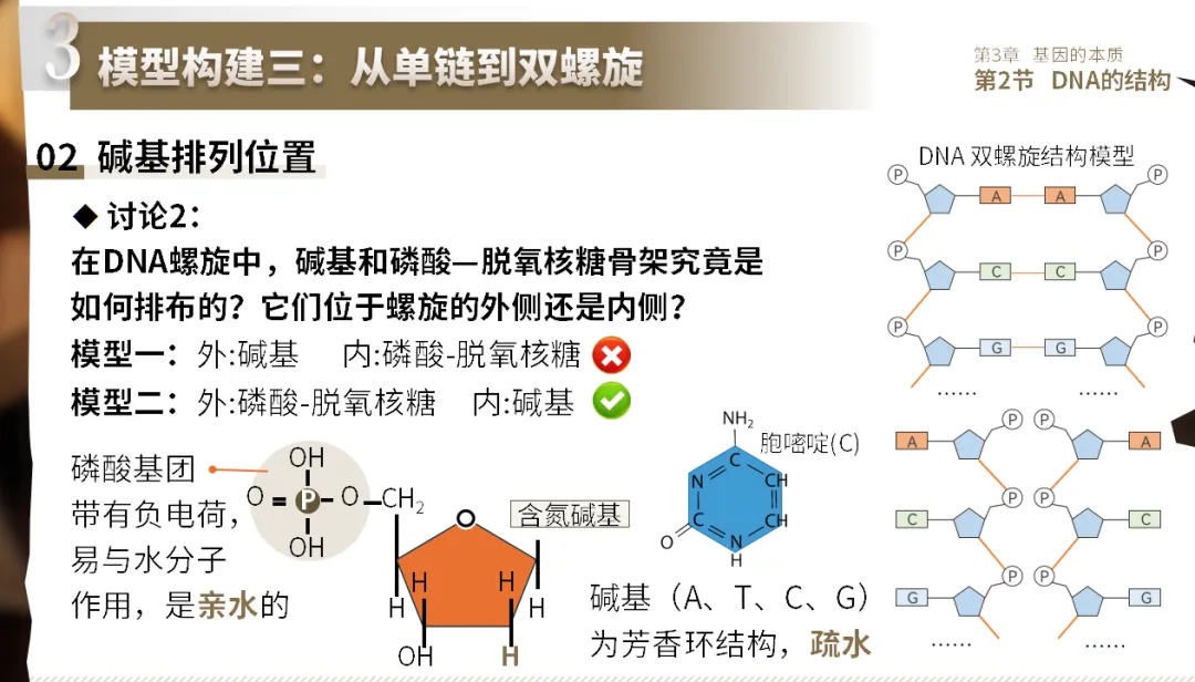 呈现两种对立模型,引导学生运用亲水/疏水化学原理分析判断,得出“骨架在外、碱基在内”的结论。