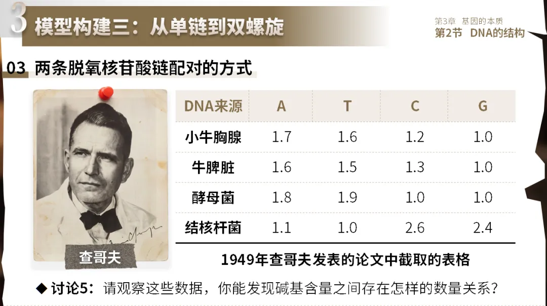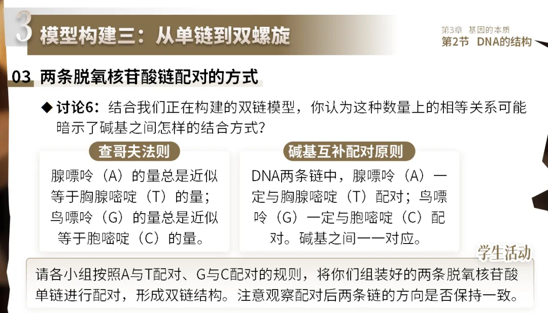 展示查哥夫实验数据,学生归纳A=T、G=C的规律;根据规律推测碱基配对方式;小组按规则将两条单链配对。