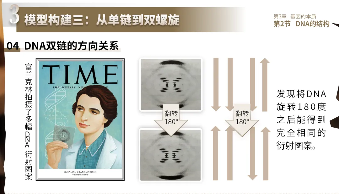 展示学生模型中“同向”与“反向”的分歧;引入富兰克林旋转180°衍射图相同的证据;推理得出“反向平行”结论,修正模型。