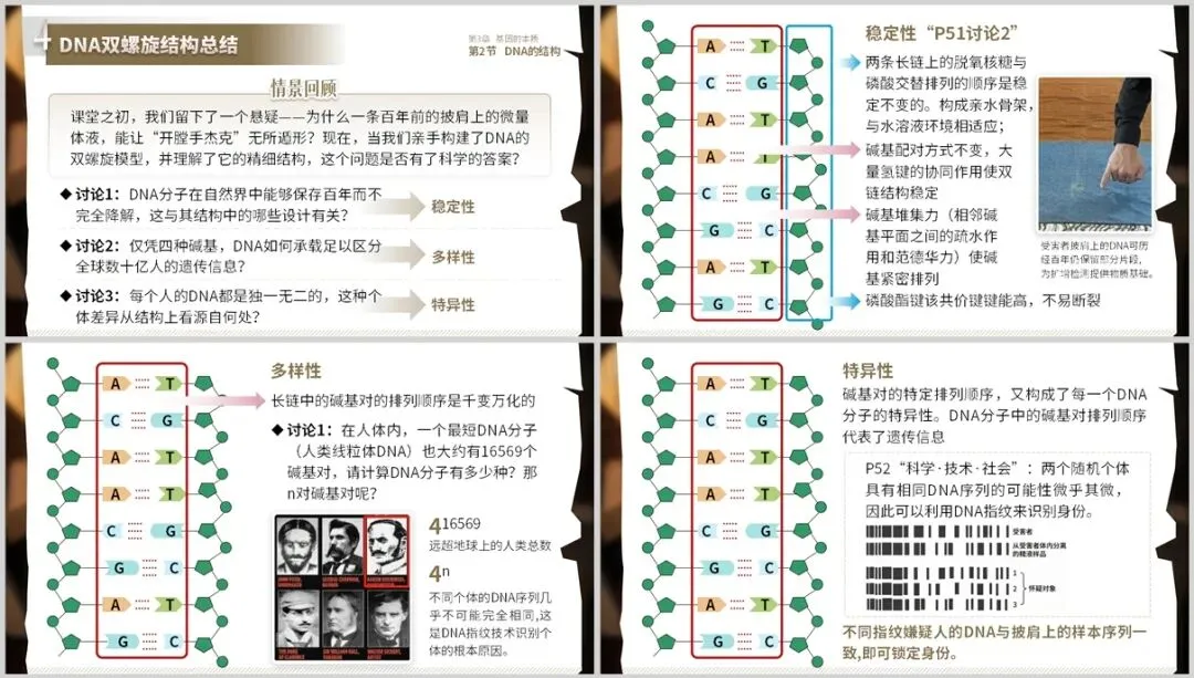 课堂最后,从DNA的稳定性、多样性、特异性三大特性解释“百年物证”原理,首尾呼应,将结构特性与破案原理深度关联,实现知识迁移和升华。
