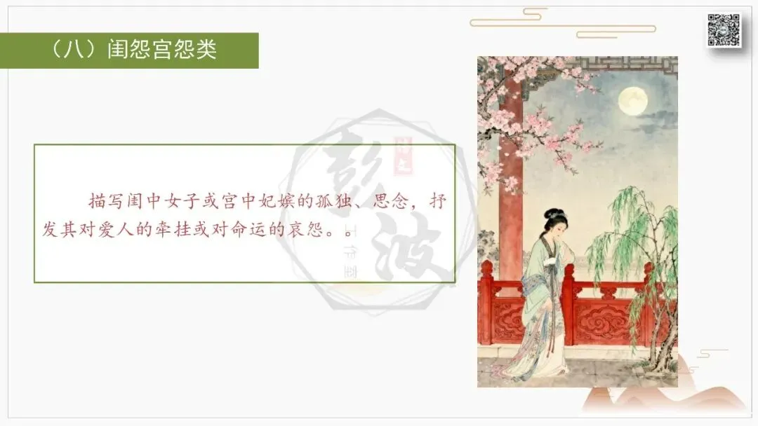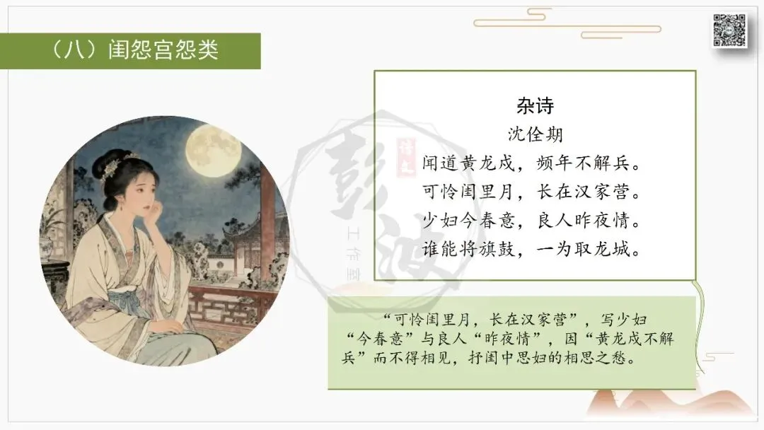 王维的"明月松间照,清泉石上流"(《山居秋暝》)绘出山水诗的空灵意境,王昌龄的 "黄沙百战穿金甲,不破楼兰终不还"(《从军行》)尽显边塞诗的慷慨悲壮。李商隐的 "春蚕到死丝方尽,蜡炬成灰泪始干"(《无题》)将爱情诗的缠绵悱恻推向极致,杜牧的 "商女不知亡国恨,隔江犹唱后庭花"(《泊秦淮》)则藏着咏史诗的深沉叹息。
