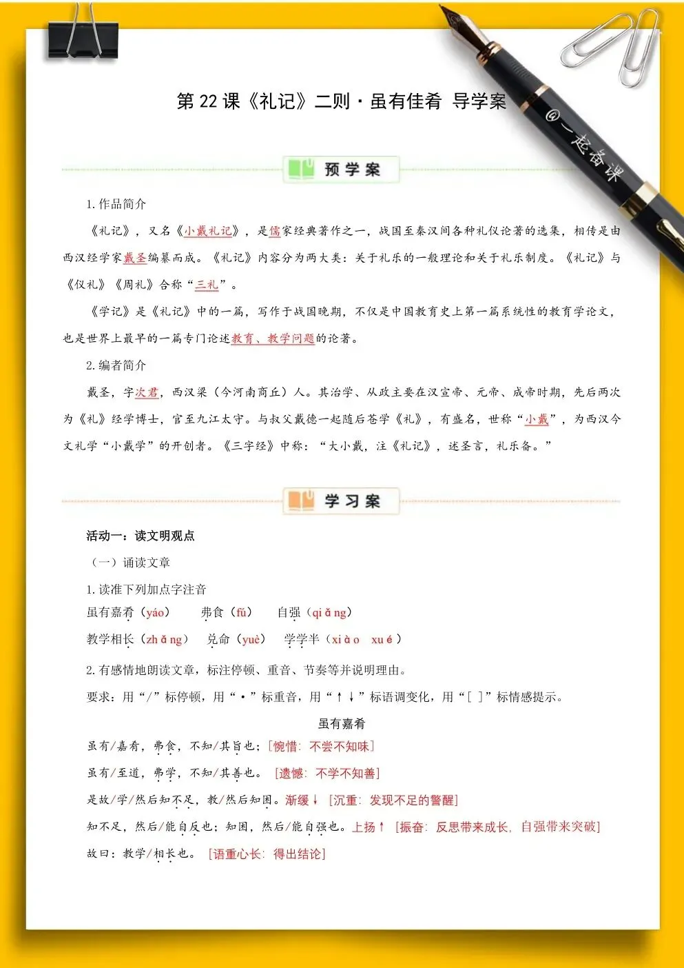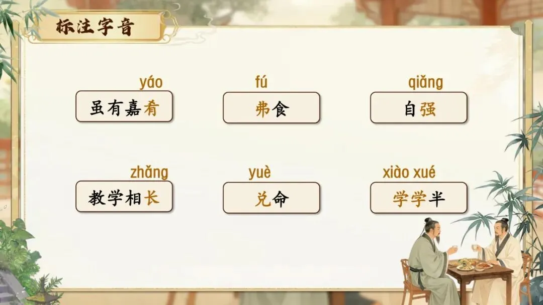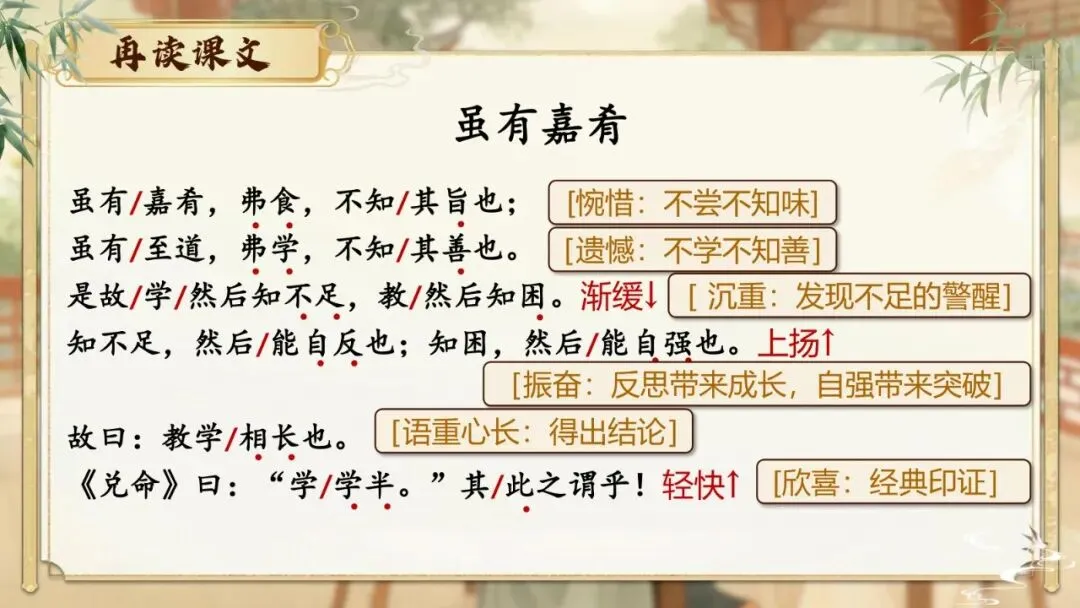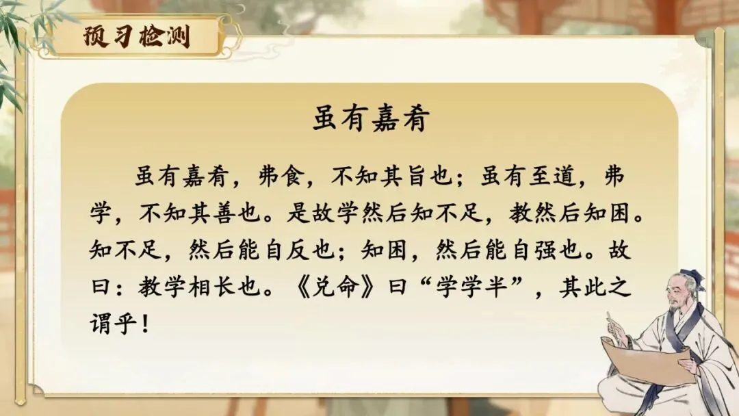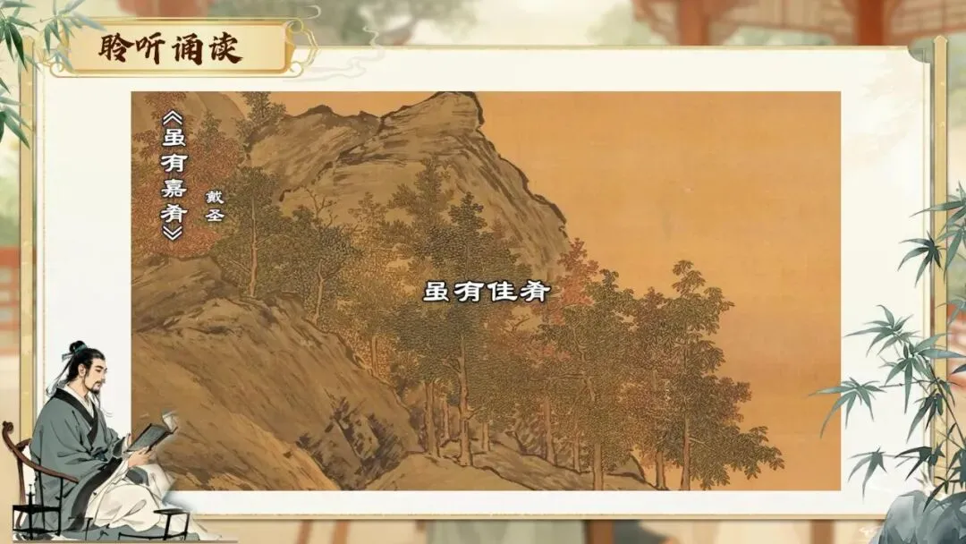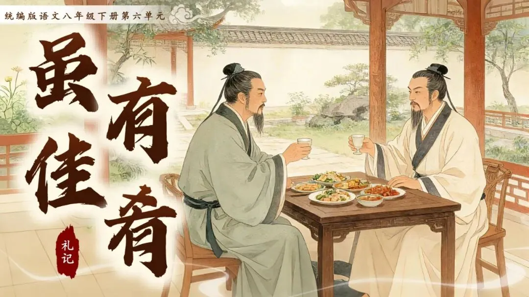 《虽有嘉肴》节选自《礼记·学记》。《学记》是我国乃至世界上最早的一篇系统性教育学论文,对教育目的、教学原则、师生关系等均有精辟论述,至今仍具有重要的现实意义。