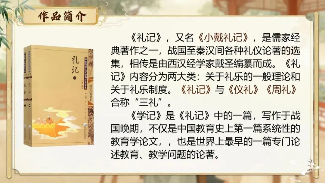 《学记》是《礼记》中的一篇,写作于战国晚期,不仅是中国教育史上第一篇系统性的教育学论文,,也是世界上最早的一篇专门论述教育、教学问题的论著。