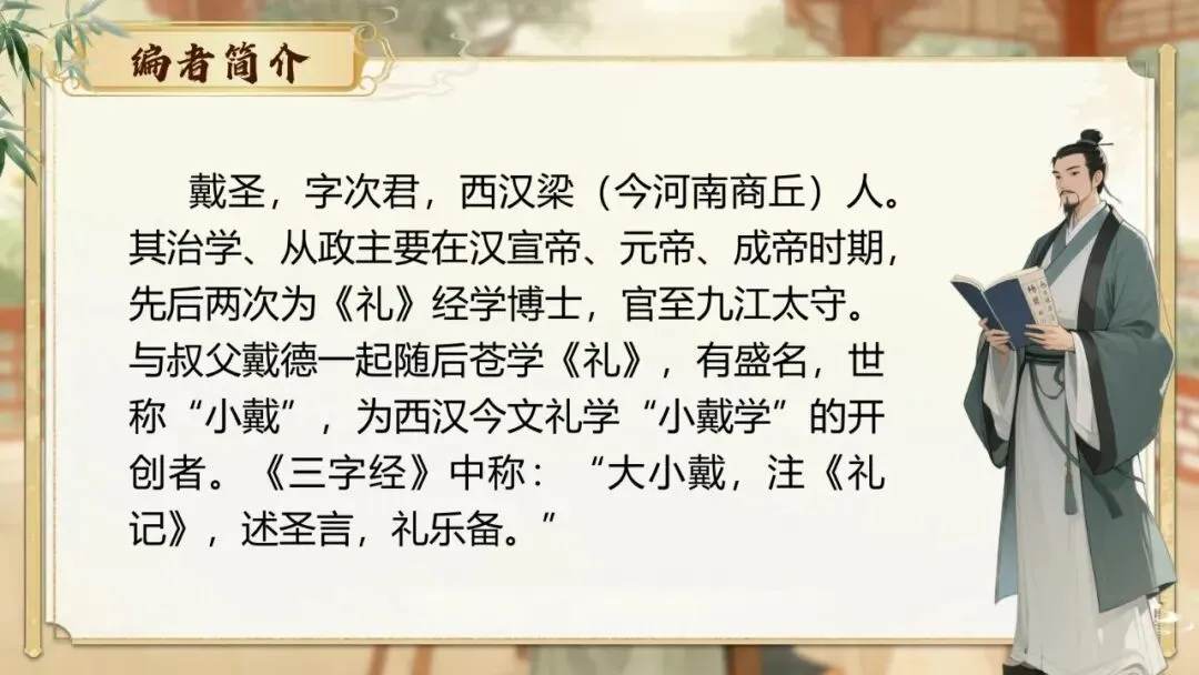 戴圣,字次君,西汉梁(今河南商丘)人。其治学、从政主要在汉宣帝、元帝、成帝时期,先后两次为《礼》经学博士,官至九江太守。与叔父戴德一起随后苍学《礼》,有盛名,世称“小戴”,为西汉今文礼学“小戴学”的开创者。《三字经》中称:“大小戴,注《礼记》,述圣言,礼乐备。”