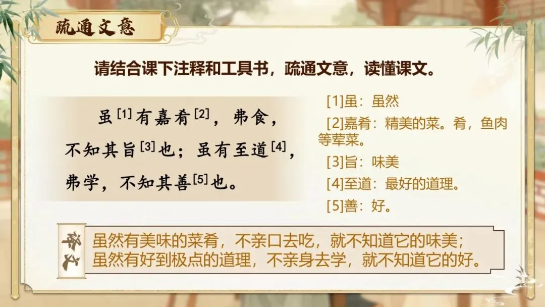 ①虽有嘉肴,弗食,不知其旨也;虽有至道,弗学,不知其善也。