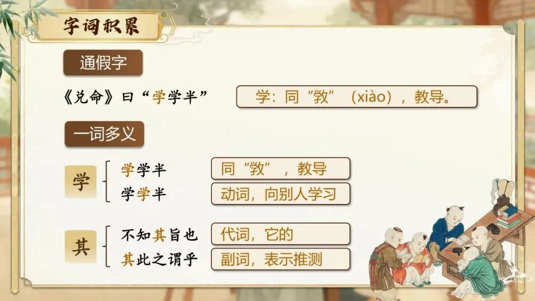 难点:理解文中“教学相长”的含义与现代汉语中该词的区别;品味对偶句式在论事说理中的表达效果。