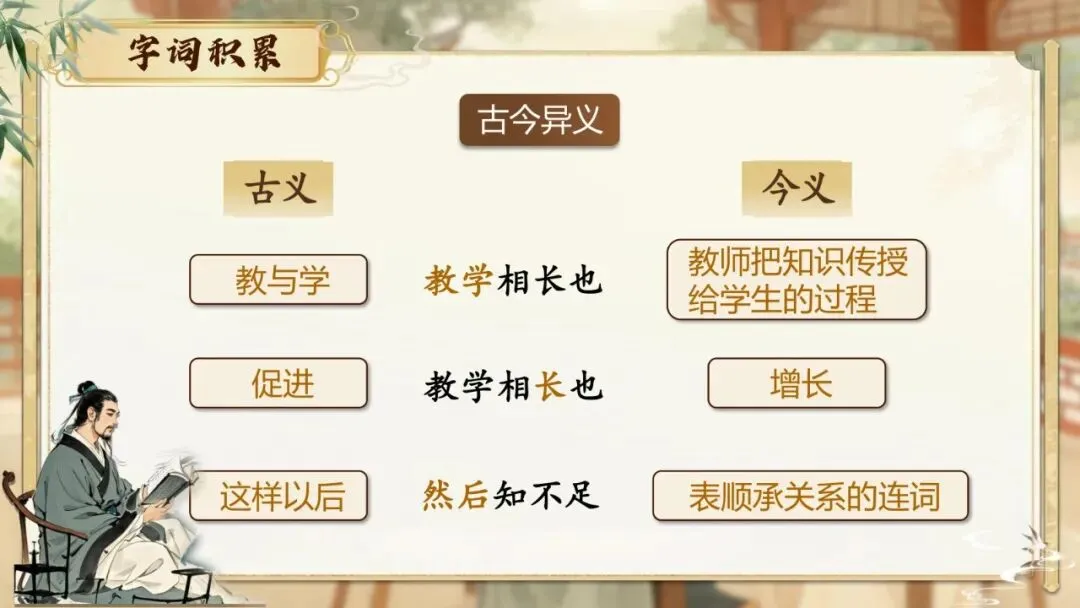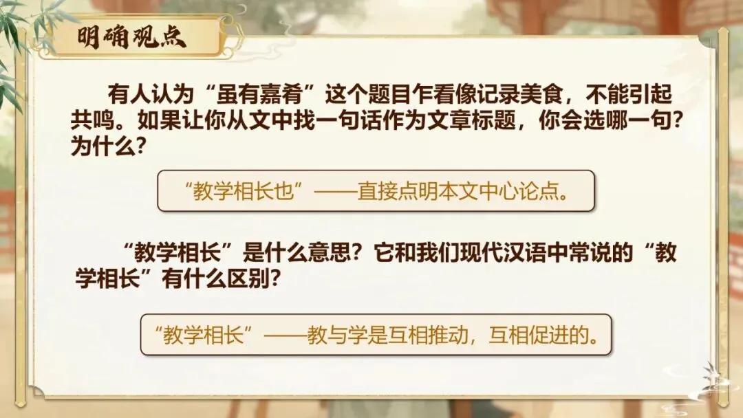 2.思维发展:理清文章“类比引入—层层推进—得出结论—引用佐证”的论证思路,分析“教学相长”观点的辩证内涵,区分古今两种“教学相长”的概念差异。
