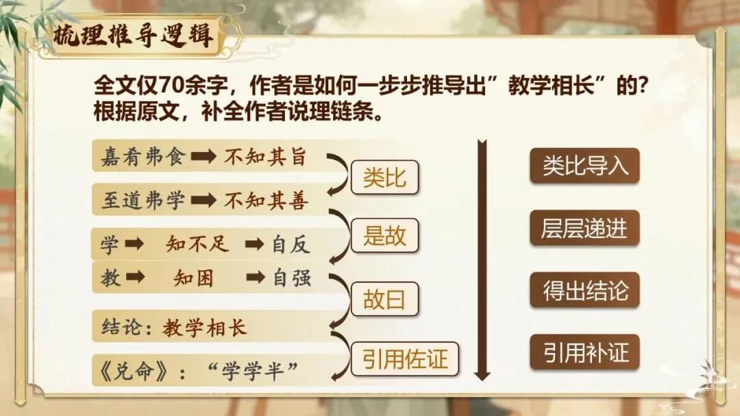 小结: 类比导入(嘉肴弗食→至道弗学)——层层推进(学知不足→教知困)——得出结论(教学相长)——引用补证(《兑命》学学半)。
