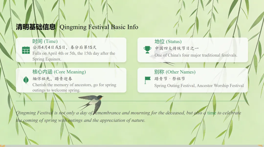 2021 版课件内容聚焦传统清明文化,缺乏基础信息铺垫和现代延伸,课堂教学的完整性和延展性稍显不足。2026 版在原版基础上新增四个板块:✅ 清明基础信息页:开篇新增节日基础认知,标注清明的时间、地位、核心内涵和别称,如 “公历 4 月 4/5 日,中国四大传统节日之一,核心内涵为缅怀祖先、踏青迎春”,让外国学习者先建立对清明节的整体认知;✅ 文化延伸板块:搭建中外文化连接,将清明的 “缅怀祖先” 与西方万灵节、“春日踏青” 与日本赏樱、西方野餐做对比,让外国学习者找到文化共鸣,感受 “缅怀祖先、热爱春天” 是人类共通的情感;✅ 现代清明板块:介绍现代人的清明过法,如线上祭扫、春日野餐、公益植树,让传统节日贴近当下生活,让外国学习者了解清明节的 “古今传承与创新”。✅ 实用表达板块:精选 3 句清明相关的简易汉语表达,如 “清明安康!”“我想去踏青。”“青团很好吃。”,标注拼音、声调和英文翻译,让外国学习者学以致用,实现 “学文化 + 练汉语” 的双重目标。