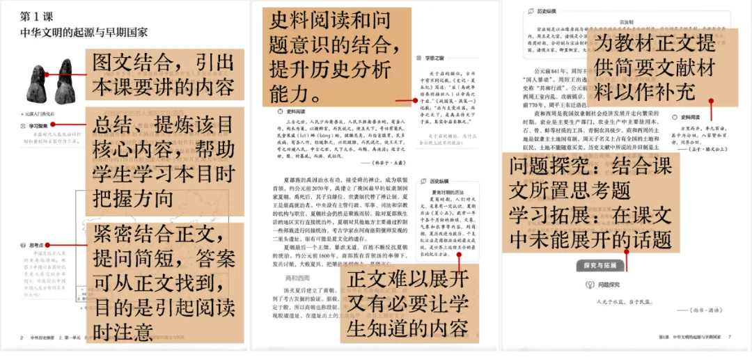 ①(证史一致)多重证据,孤证不立。 ②(史论)基于史实、多角度进行(有逻辑、史观) 二、如何学习历史? (一)初高中历史不同的学习要求 (中考真题)有人说,我们今日继承的这大块版图基本上是康熙皇帝时牢固地确定了的。以下属于康熙帝巩固边疆的措施是(B) A.打击倭寇 B.平定准噶尔部叛乱 C.设立驻藏大臣 D.制定“金瓶掣签”制度 (高考真题)先秦贵族尚马车,贱牛车,此风秦汉犹存。及至东汉晚期,天子至士因牛车慢、稳、宽敞、严密,可障帷设几、任意坐卧而竞相乘坐,出行乘牛车遂成为一种风尚。这种“风尚”反映了(A) A.政治衰颓的时代景象 B.戒奢尚俭的社会风气 C.重农崇耕的思想观念 D.豪强势重的政治现实 初中考察:是什么(时间、事件、人物等)重历史知识的时序性、基础性考查,偏重基础史实的掌握。 高中考察:是什么(性质)、为什么(原因)、怎么样(影响、评价),重历史知识的系统性、综合性,更强调逻辑思维、分析思辨能力。 注:此处可以美国以军事突袭方式抓捕主权国家领导人侵略事件为例,加以简要说明。 1989年12月20日,美国政府以“保护侨民、重建民主制度”等为借口,对巴拿马发起军事行动,目的是推翻时任巴拿马政府首脑曼努埃尔·安东尼奥·诺列加领导的政府,永久控制巴拿马运河。 2026年1月,特朗普近日公开表示,“我们在那里(委内瑞拉)有很多石油,你们也知道,他们把我们的公司赶了出去,我们想要回这些石油(的开采权)。” (二)了解教材内容构成、体例 1.单元导语:概述单元主要内容和学习要求,了解单元的内容线索和应掌握的必备知识。 2.单课:导入和学习聚焦、与正文配套的思考点,正文之外的学思之窗、历史纵横和补充材料的史料阅读、最后有探究和拓展。