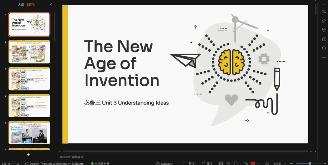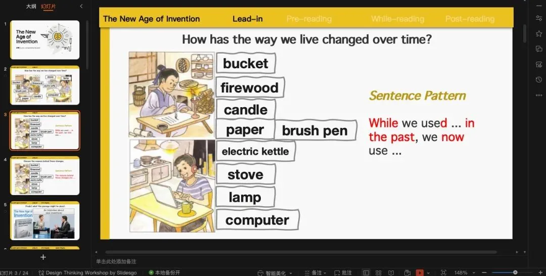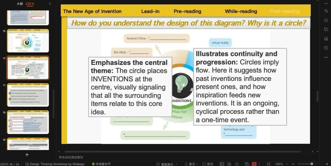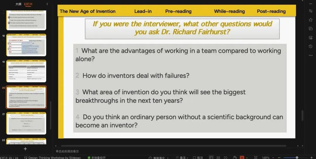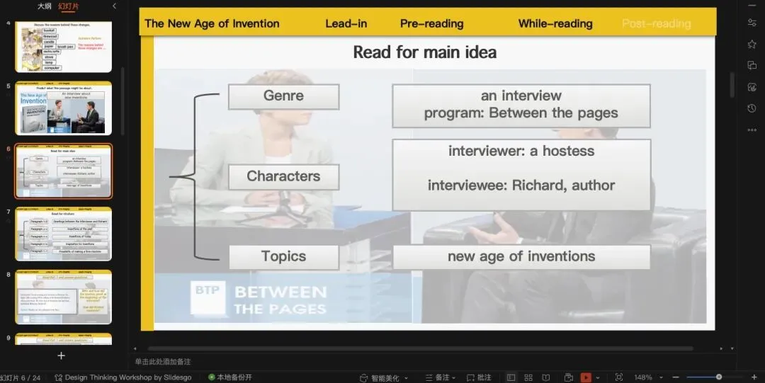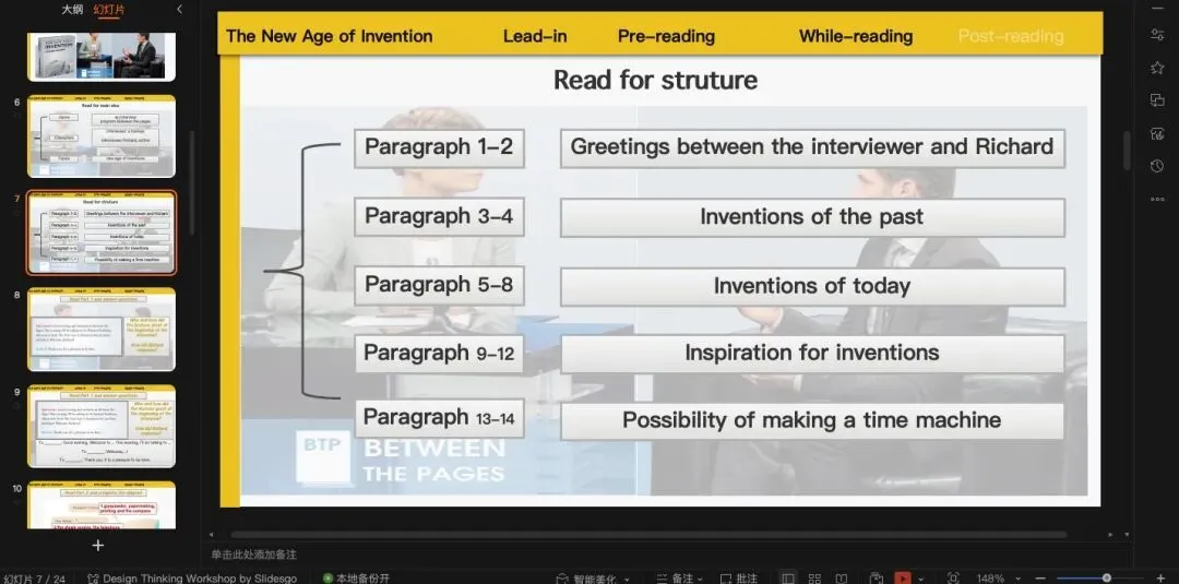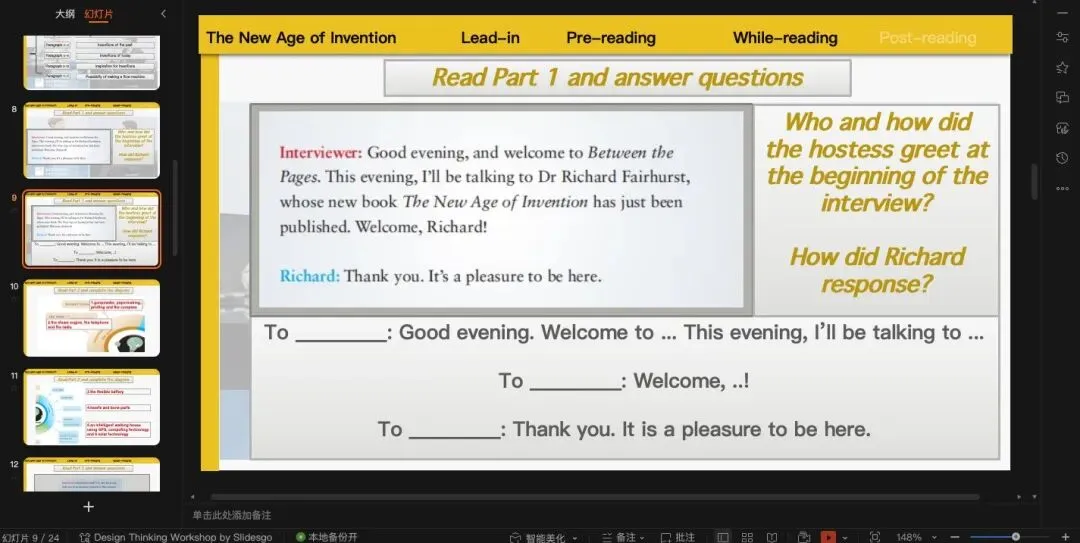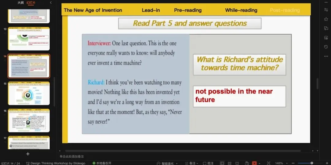 既然有prediction,就一定有check prediction沿用上一个环节的预测,那我们引导学生快速浏览全文确定文章的基本信息,包括体裁,人物和主题。这里可以做的细一点,引导学生观察书名,节目名字等信息。虽然这篇文章是采访,但是根据问题的内容也是可以划分文章结构的。第一部分引导学生体会采访这种genre的文章的语用pragmatics知识,尤其是主持人的greetings。这一步也是在为后面的读后活动做准备。第二部分主要是根据教材中的读后活动进行思维导图的填写,完成这一部分的细节阅读,理解古今中外的创新发明。第三部分主要是引导学生读出现在科学家的工作方式:团队 VS 个人。第四部分主要是根据教材中的读后活动进行思维导图的填写,理解文章提到的invention背后的真正原因。第五部分主要是引导学生理解人物对于时间机器的情感态度,完成信息推测。(原创ppt)