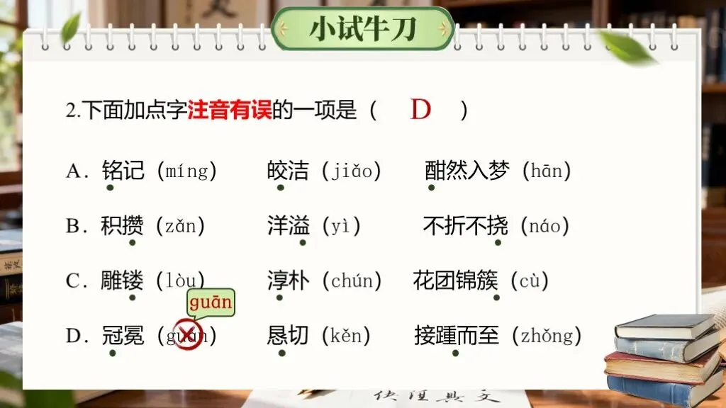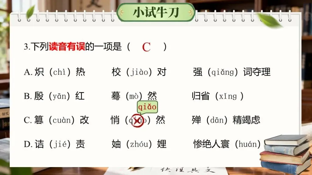 考查形式:以选择题、填空题为主,要求选择读音或字形完全正确/错误的一项,或根据拼音写汉字、给加点字注音。