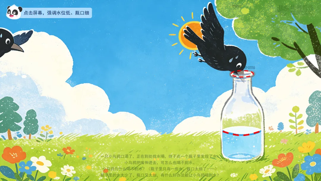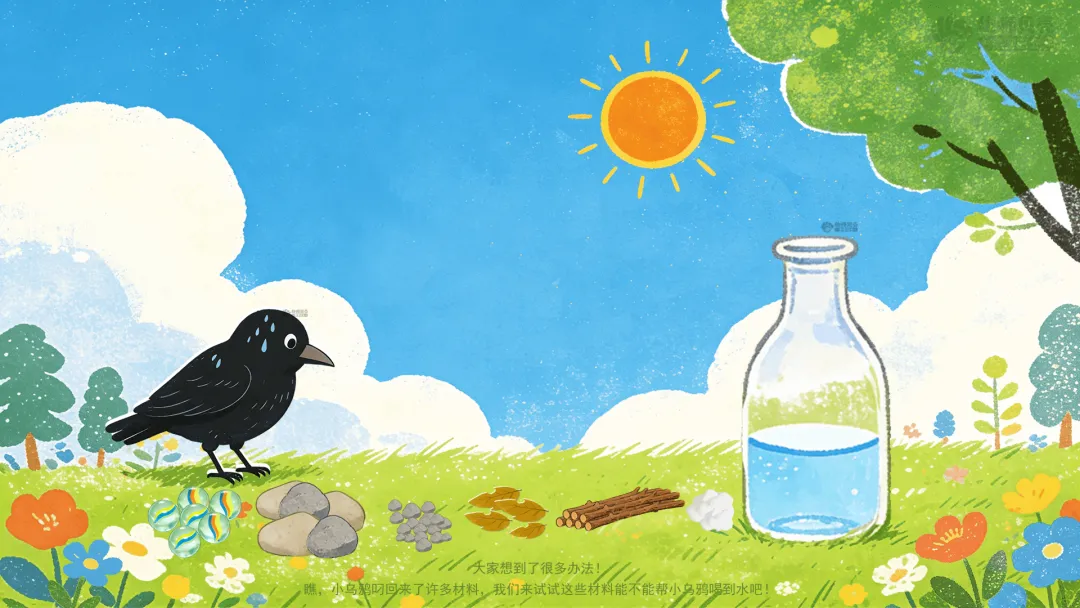 ——小乌鸦为什么喝不到水?(瓶子里只有一些水、瓶口太细了……)