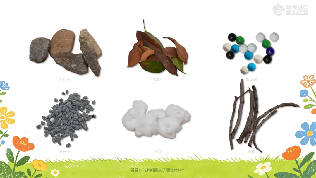 ——大家想到了很多办法!瞧,小乌鸦叼回来了许多材料,我们来试试这些材料能不能帮小乌鸦喝到水吧!