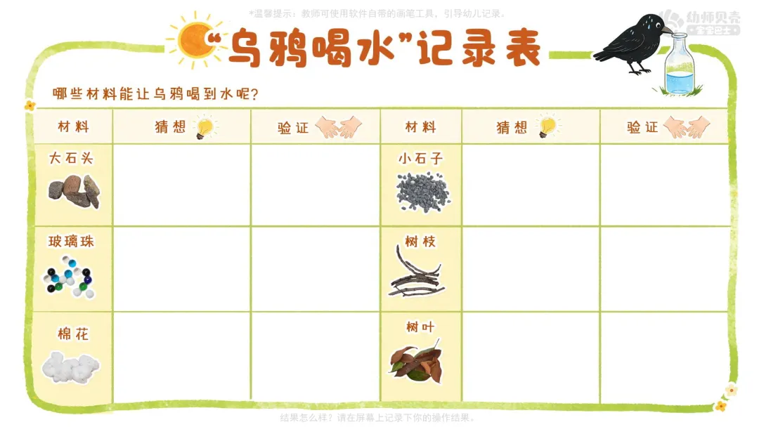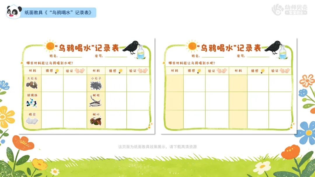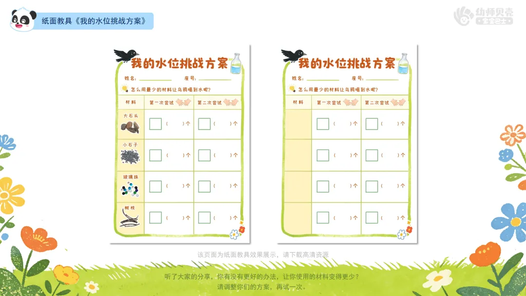 l纸面教具:《“乌鸦喝水”记录表》《我的水位挑战方案》。