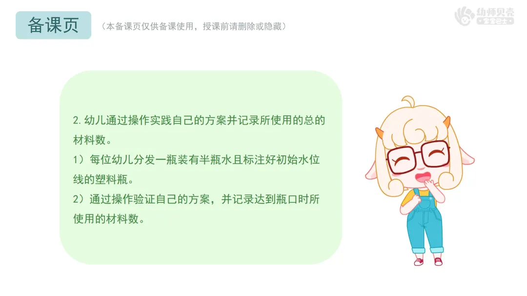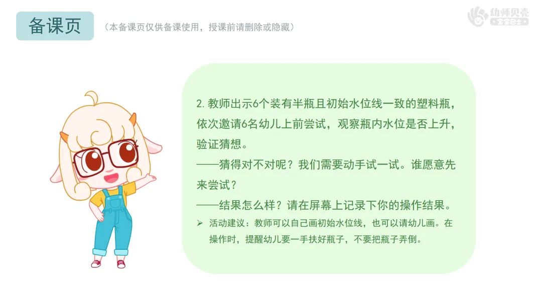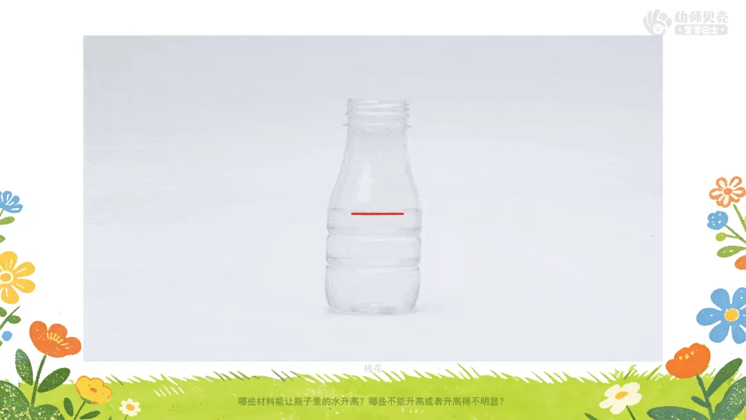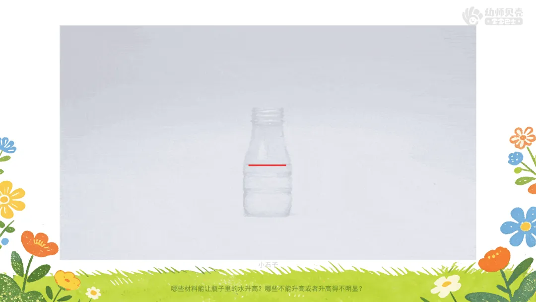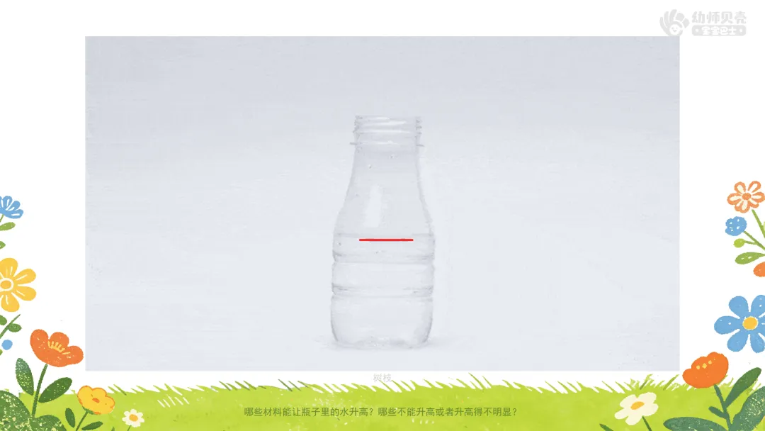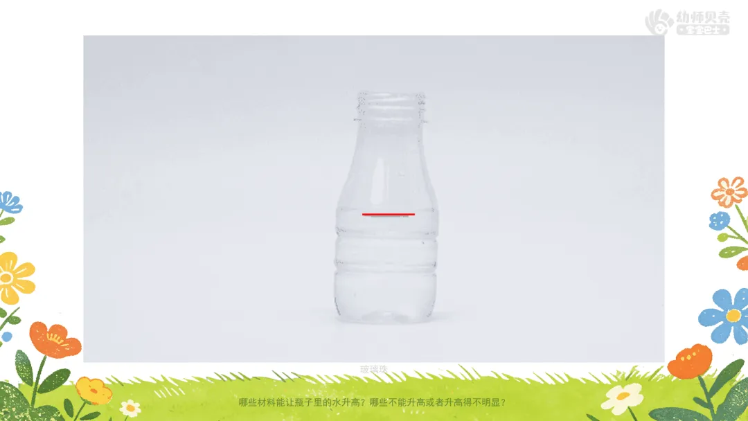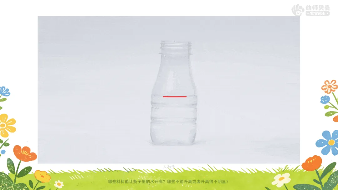 2.第二、三次操作:每位幼儿一瓶装有半瓶水且画好初始水位线的塑料瓶;幼儿人手一份大石头、小石子、玻璃珠、树枝等材料。