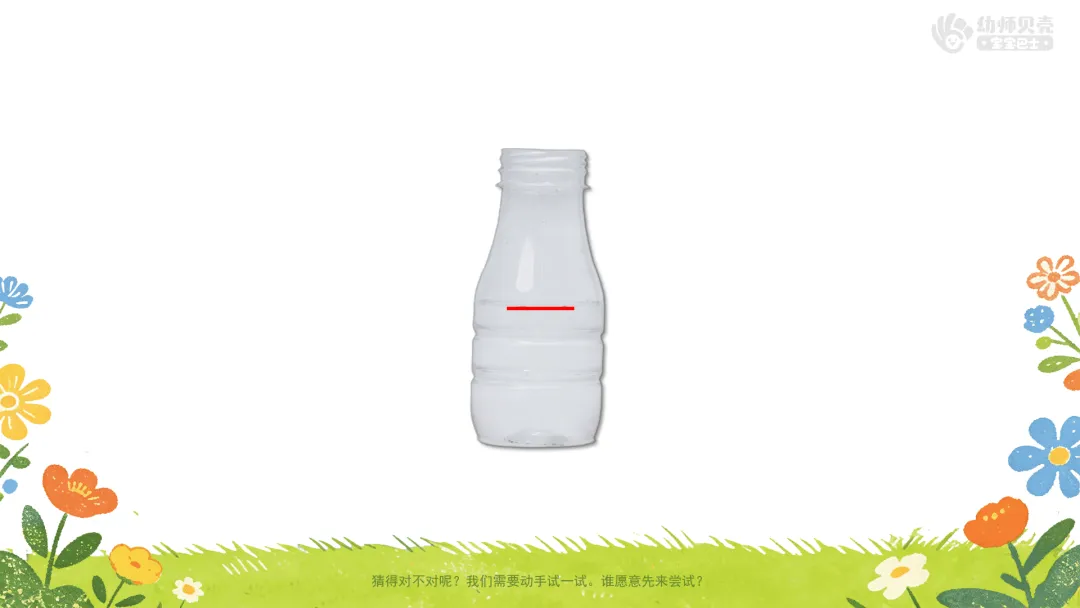 Ø活动建议:教师可以自己画初始水位线,也可以请幼儿画。在操作时,提醒幼儿要一手扶好瓶子,不要把瓶子弄倒。