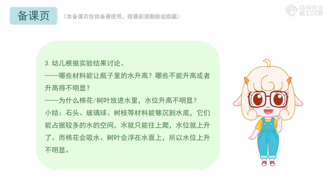 l重点:通过操作发现并理解石头等材料沉底后占据水的空间,使水位上升的现象。