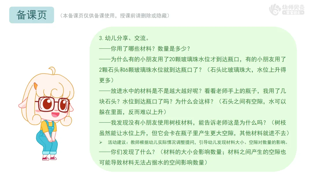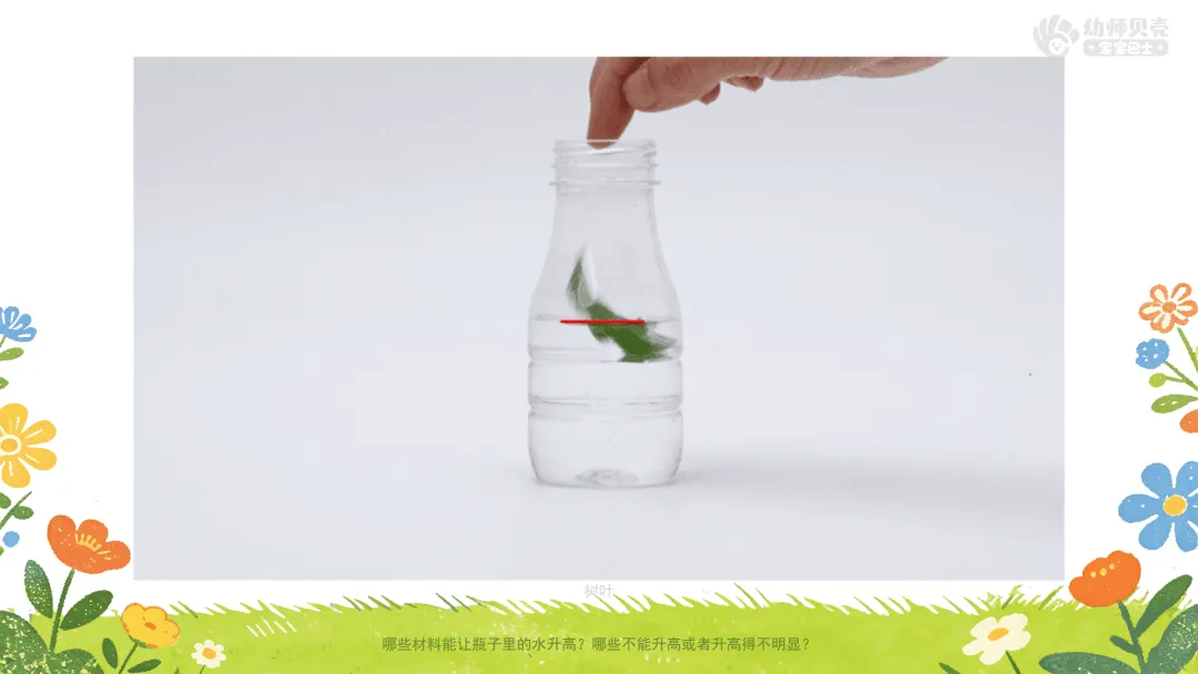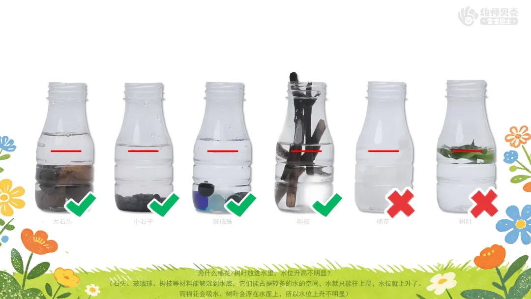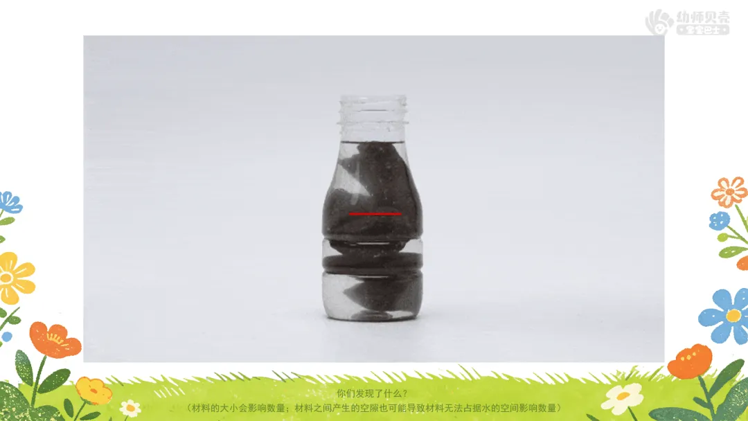 ——我发现没有小朋友使用树枝材料,能告诉老师这是为什么吗?(树枝虽然能让水位上升,但它会卡在瓶子里产生更大空隙,其他材料就进不去)
