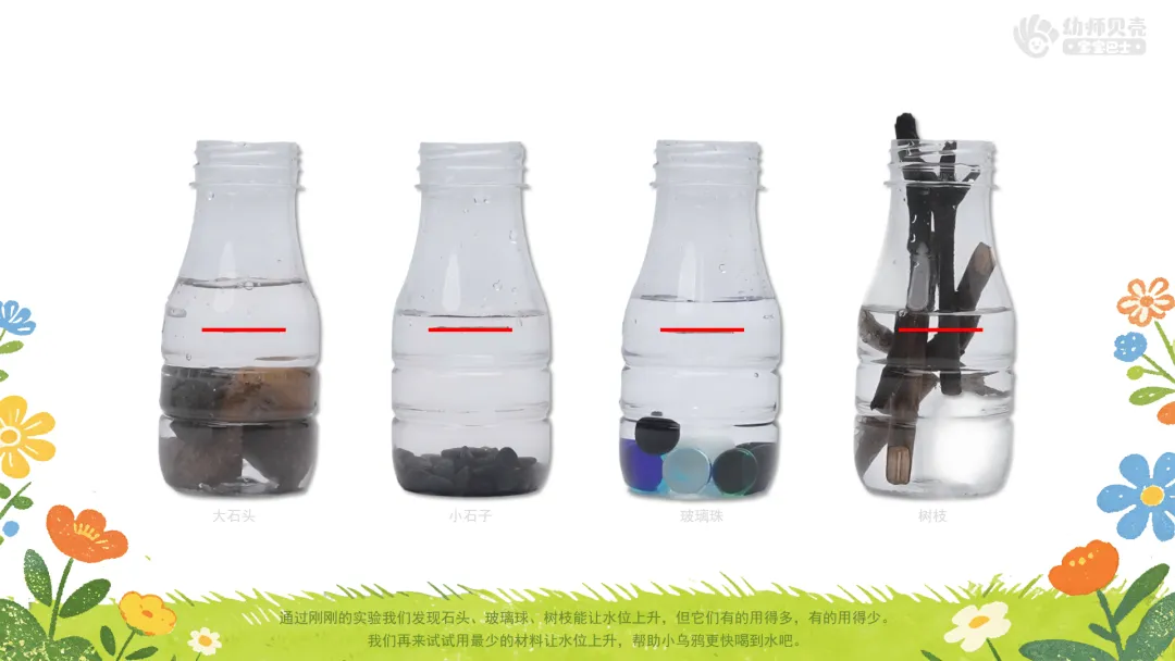 ——通过刚刚的实验我们发现石头、玻璃球、树枝能让水位上升,但它们有的用得多,有的用得少。我们再来试试用最少的材料让水位上升,帮助小乌鸦更快喝到水吧。