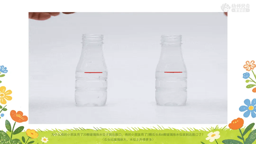 ——为什么有的小朋友用了20颗玻璃珠水位才到达瓶口,有的小朋友用了2颗石头和6颗玻璃珠水位就到达瓶口了?(石头比玻璃珠大,水位上升得更多)