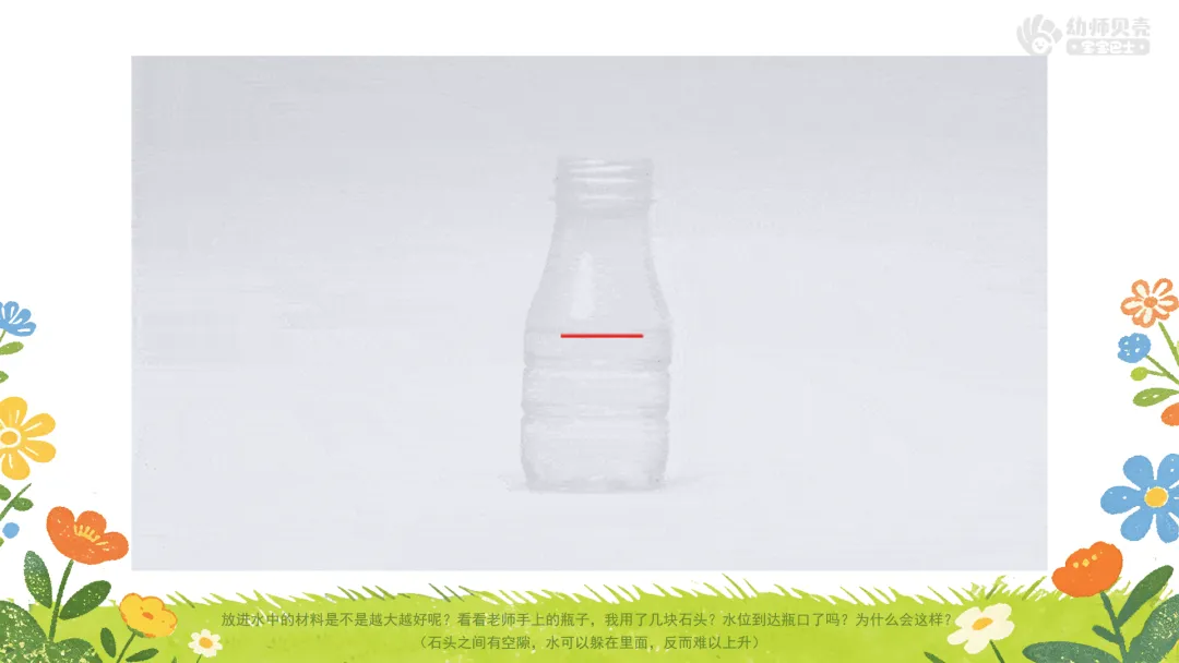 ——放进水中的材料是不是越大越好呢?看看老师手上的瓶子,我用了几块石头?水位到达瓶口了吗?为什么会这样?(石头之间有空隙,水可以躲在里面,反而难以上升)