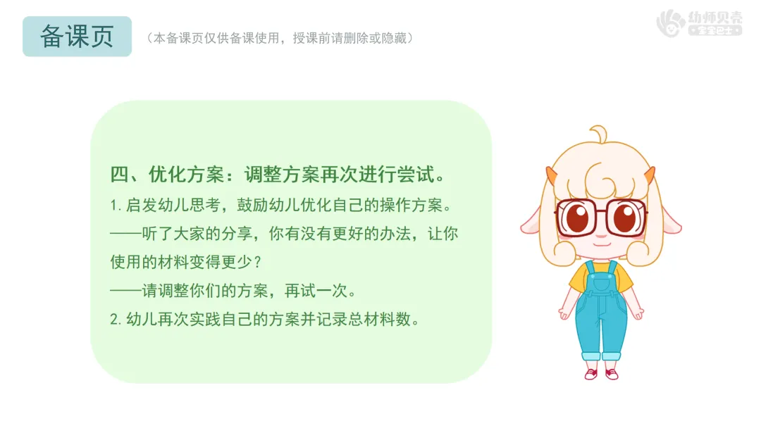 1.启发幼儿思考,鼓励幼儿优化自己的操作方案。