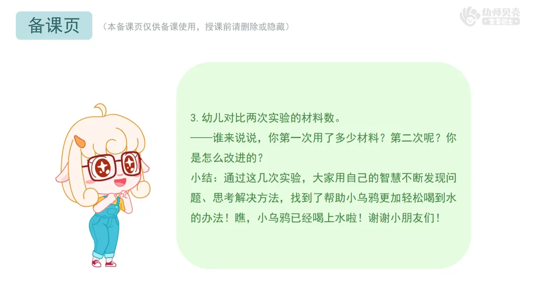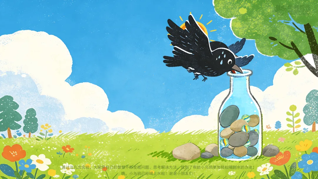 小结:通过这几次实验,大家用自己的智慧不断发现问题、思考解决方法,找到了帮助小乌鸦更加轻松喝到水的办法!瞧,小乌鸦已经喝上水啦!谢谢小朋友们!