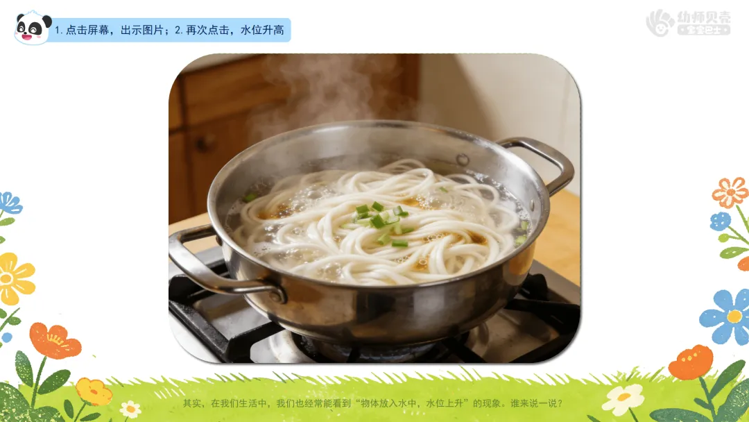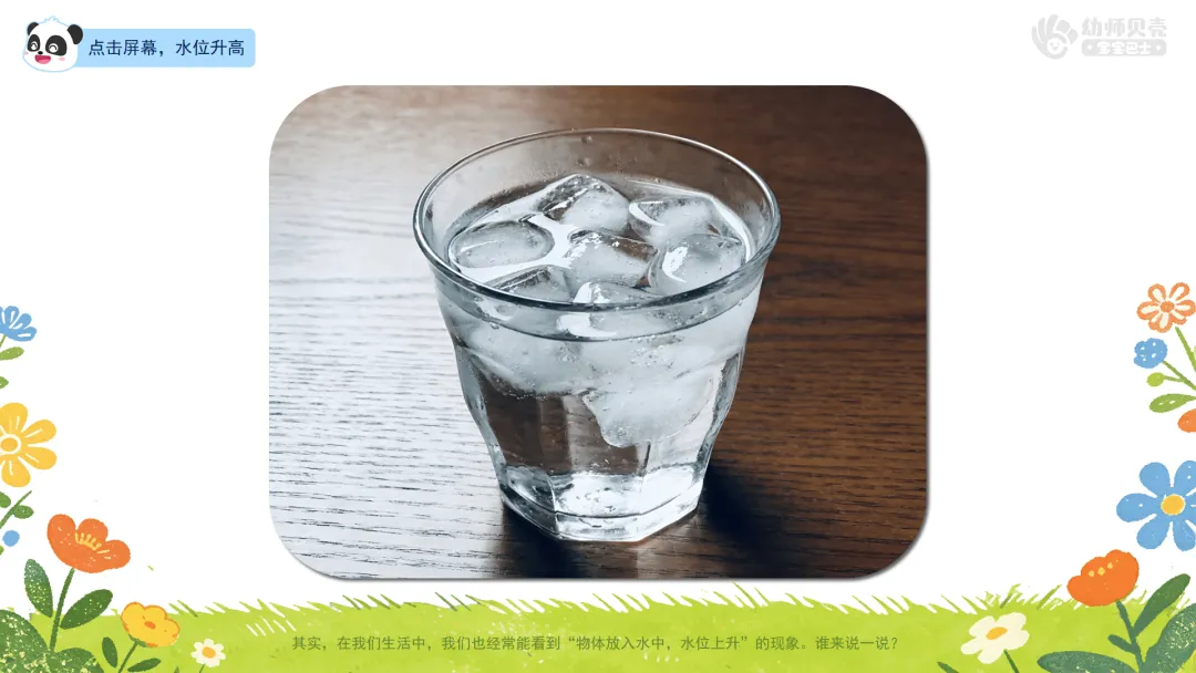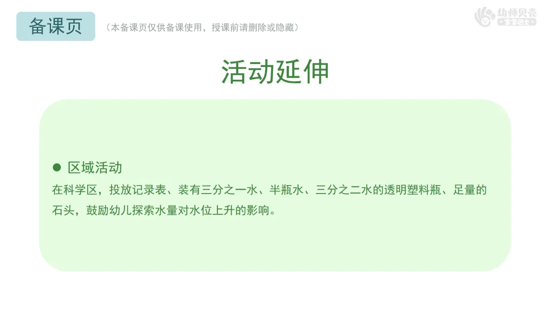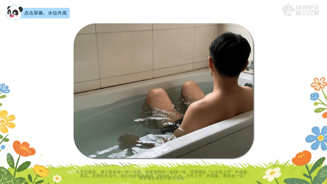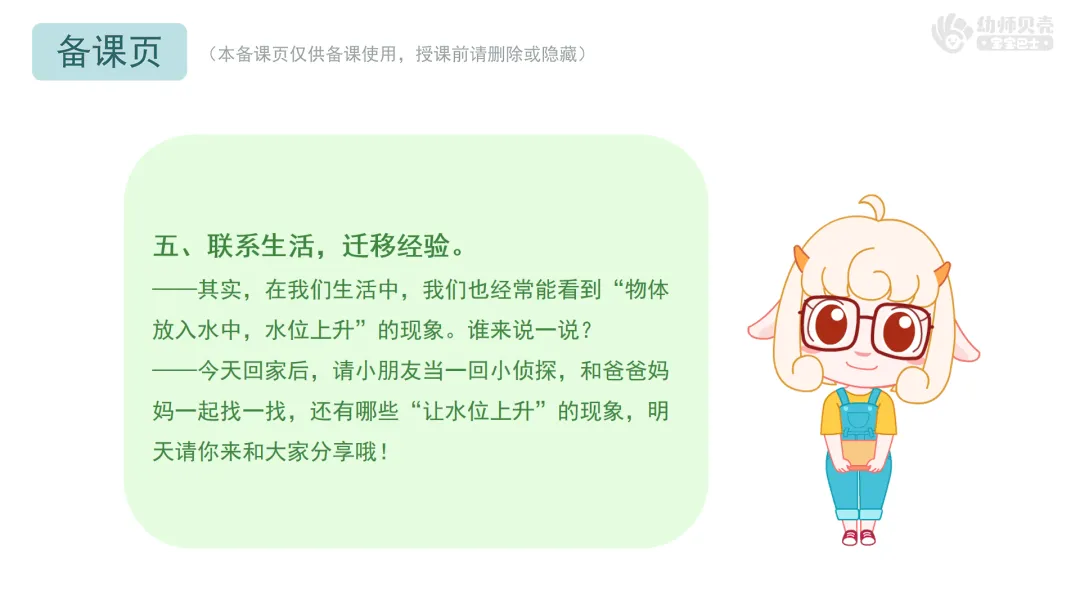 ——今天回家后,请小朋友当一回小侦探,和爸爸妈妈一起找一找,还有哪些“让水位上升”的现象,明天请你来和大家分享哦!