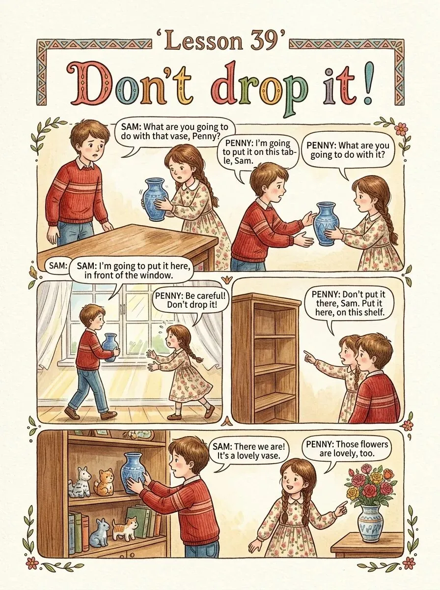情景说明:第39课的场景发生在家中。Sam和Penny(可能是夫妻或室友)正在处理一个花瓶。Penny打算把花瓶放在桌子上,但Sam提出了不同意见,并主动接手。随后两人就花瓶的摆放位置进行了简单的讨论,期间Penny担心Sam把花瓶摔了,并最终指挥Sam把花瓶放到了架子上。对话展现了日常生活中就物品摆放进行协商、发出指令和提醒的常见互动。第40课则是对第39课引入的核心句型“What are you going to do? I'm going to...”进行系统性的扩展和替换练习,围绕“放置物品”、“携带物品”、“开关电器”、“穿戴衣物”等高频生活场景进行强化训练。