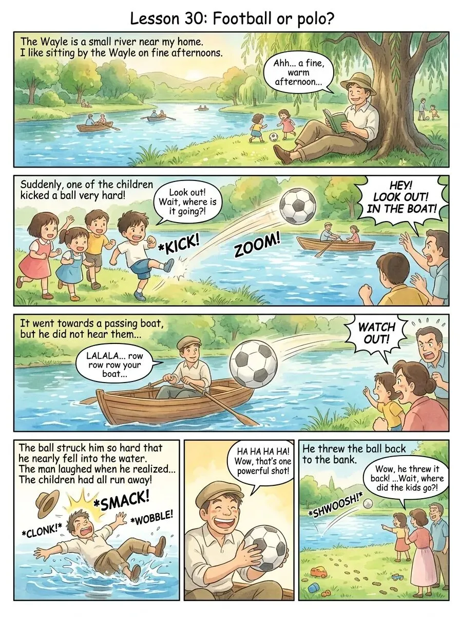 A. 层次化英文问题与答案Level 1 (Factual):1. Q: What is the name of the river in the story? A: The Wayle.2. Q: What were the children doing when the writer arrived? A: Playing games on the river bank.3. Q: What did the people on the bank do when they saw the ball going towards the boat? A: They called out to the man in the boat.4. Q: Where did the children go after the ball hit the man? A: They all ran away.Level 2 (Inferential):5. Q: Why do you think the man in the boat didn't hear the people calling out? A: Perhaps he was concentrating on rowing, or the distance and ambient noise made it hard to hear.6. Q: How do you know the ball was kicked with great force? A: Because the text says it was kicked "very hard" and it struck the man "so hard that he nearly fell into the water."7. Q: What does the reaction of the man (laughing and throwing the ball back) tell you about his character? A: He is good-natured, forgiving, and has a sense of humor.8. Q: Why might the children have run away immediately? A: They were probably scared that the man would be angry and shout at them or tell their parents.Level 3 (Evaluative):9. Q: Do you think the children's decision to run away was the right one? What could they have done instead? A: Not the most responsible; they could have stayed to apologize.10. Q: What message does the author want to convey about dealing with minor accidents in daily life? A: We should not take minor mishaps too seriously; a forgiving and humorous attitude can turn an unpleasant situation into a light-hearted moment.11. Q: Imagine you are the man in the boat. Describe your feelings. A: Shock and confusion, then amusement, deciding there was no reason to be upset.12. Q: Compare this story to a similar situation in a city park with cyclists. How would the dynamics be different? A: The cyclist might be more annoyed due to safety concerns; children might be less likely to run far.B. 多类型拓展阅读1. 时事新闻拓展 (Current News Extension)Title: Near Miss on the SerpentineLast Saturday afternoon, a similar amusing incident occurred on the Serpentine lake in London's Hyde Park. A group of teenagers were practicing their frisbee skills when an over-enthusiastic throw sent the disc soaring towards a classic wooden rowboat occupied by an elderly couple. The frisbee clipped the edge of the boat before landing in the water with a splash. The couple, initially startled, waved off the teenagers' frantic apologies with smiles. The young man who made the throw even swam out to retrieve the frisbee. "It's all part of the fun of a summer's day in the park," the gentleman was quoted saying. The incident was resolved with laughter, much like our textbook story, proving some scenes are timeless.语言点映射:clipped (轻击,类比struck), startled (吃惊的), waved off (挥手表示不在意,类比laughed), retrieve (取回,类比threw back).引导性问题:What are the similarities and differences between this incident and the one in the textbook?2. 文化背景解析 (Cultural Background)Title: "Polo" in "Football or Polo?" -- A Nod to British LeisureThe title "Football or Polo?" cleverly hints at two popular British outdoor activities. "Football" here almost certainly refers to the casual kicking of a ball, not an organized match. "Polo," however, is more specific. While water polo is a team sport played in a pool, the "polo" in this context likely refers to "canoe polo" or simply the playful idea of a ball game involving boats. The River Wayle, though fictional, represents the countless small rivers and canals crisscrossing the British countryside, which have been used for leisure boating for centuries. The scene of people "rowing on the river" is a classic image of an English summer afternoon, evoking traditions like the Oxford and Cambridge boat race or simple family outings. This cultural backdrop makes the story feel authentically British.引导性问题:Besides rowing, what other activities are common along British rivers?3. 今昔对比分析 (Then-and-Now Analysis)Title: From Riverbanks to Screens: Changing ChildhoodsThe children in Lesson 30 are playing outside, by a river, inventing their own games. This was a very common childhood experience in the past. Contrast this with many children today. Their "play" often involves digital screens, indoors. An accidental kick sending a ball into a neighbor's garden might be replaced by an accidental in-game item sent to the wrong player. The immediate fear of getting told off might be similar, but the resolution is virtual. While the outdoor play fosters physical activity, risk assessment (don't fall in the river!), and immediate social interaction (running away together), digital play offers different skills. The story invites us to appreciate the simple, unplanned physical interactions that shaped past generations' social experiences.引导性问题:Which type of play do you think is more beneficial for children's development? Why?4. 新潮英语改写 (Trendy Rewrite)Title: Oops! #RiverFailSo, last Sunday was totally warm, right? Chilling by my local river, the Wayle, as usual. Some kids were messing around on the bank, and a few peeps were out rowing. Epic fail moment: one kid absolutely yeets the ball. I mean, YEETS it. It's heading straight for this dude's boat. Everyone's yelling "Heads up!" but he's in his own world. SMACK! The ball nails him so hard he almost does a backflip into the water. I look for the kids... ghosted! Vanished! POOF! But then, plot twist: the guy just starts laughing! He's like, "Hey kids!" and tosses the ball back. Major good vibes. #KarmaNotAngry #GoodSport语言点映射:用yeet (用力扔), peeps (people), ghosted (消失), good vibes (好氛围) 等网络流行语和标签改写,展示语言的时代变化。引导性问题:Identify three slang words or phrases in this rewrite and explain what they mean.5. 难度略高的拓展阅读 (Slightly Higher Difficulty)Title: The Physics of a Wayl