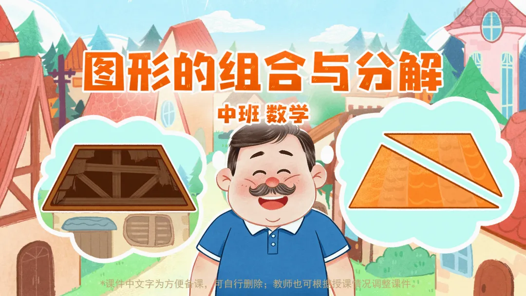 小结:今天我们认识了图形的分解与组合,知道一个图形可以分解成几个其他的图形,也可以用几个图形组合成一个新图形。希望小朋友以后在生活中,也能用不同的图形拼一拼、搭一搭,创造出更多好玩、有用的东西!