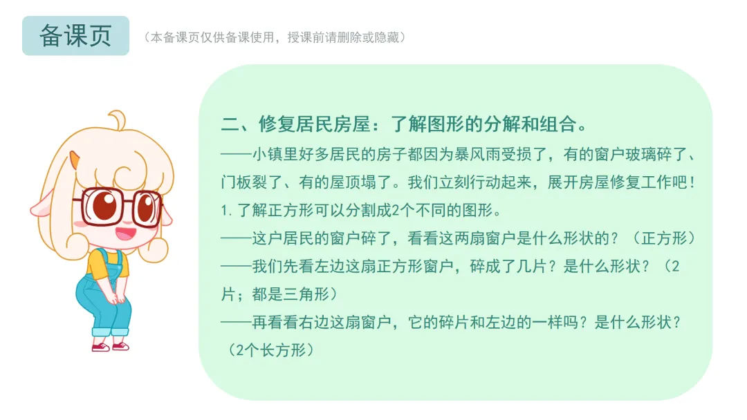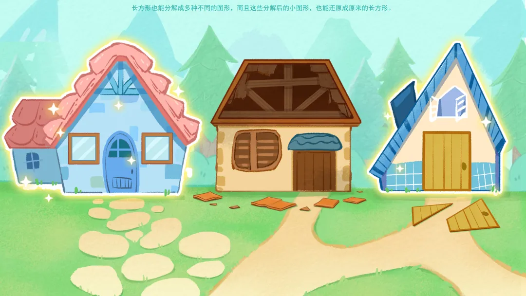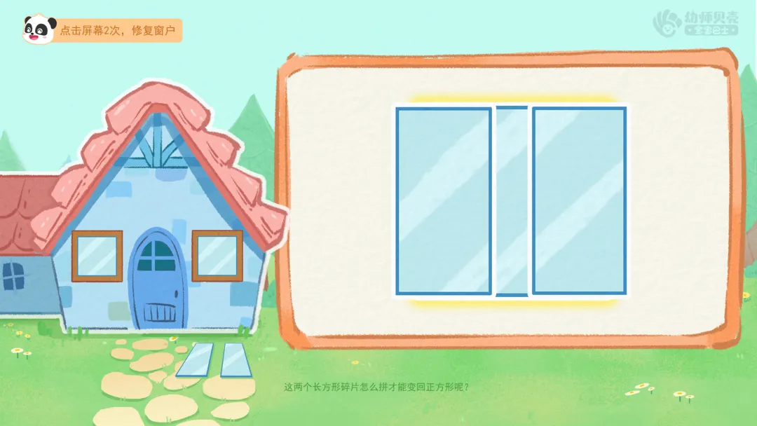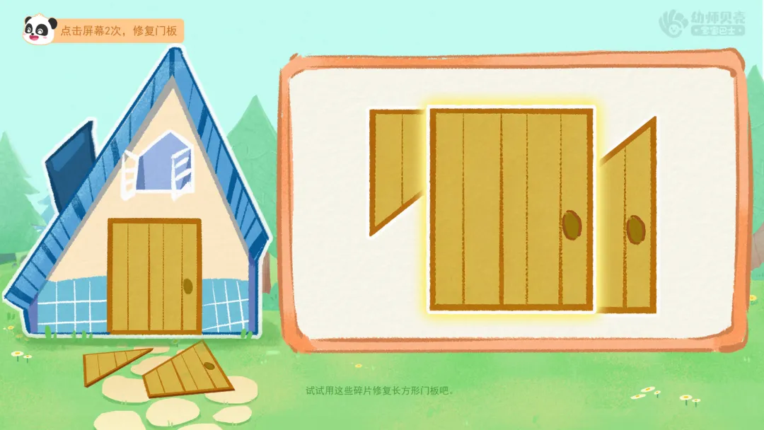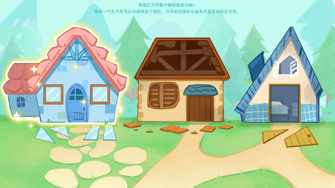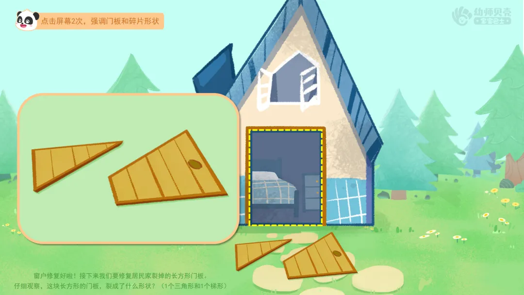 ——窗户修复好啦!接下来我们要修复居民家裂掉的长方形门板。仔细观察,这块长方形的门板,裂成了什么形状?(1个三角形和1个梯形)