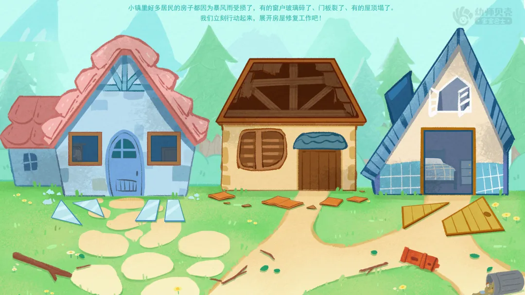 ——小镇里好多居民的房子都因为暴风雨受损了,有的窗户玻璃碎了、门板裂了、有的屋顶塌了。我们立刻行动起来,展开房屋修复工作吧!