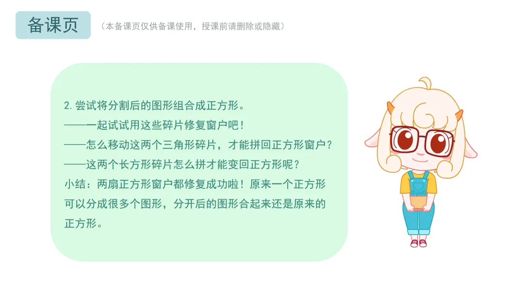 小结:两扇正方形窗户都修复成功啦!原来一个正方形可以分成很多个图形,分开后的图形合起来还是原来的正方形。