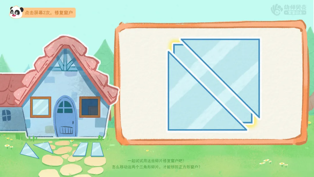 ——我们先看左边这扇正方形窗户,碎成了几片?是什么形状?(2片;都是三角形)